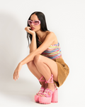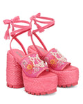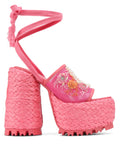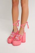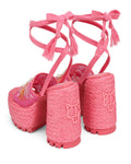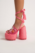 Bluebell is our brand new inflated heel, with a new toe shape for an elegant look. This style features a super cute mesh upper design with pearls, embellishments, and a summery ankle tie with a padded heel platform to match in raffia. This style also features the famous wolfe head plaque on the heel.