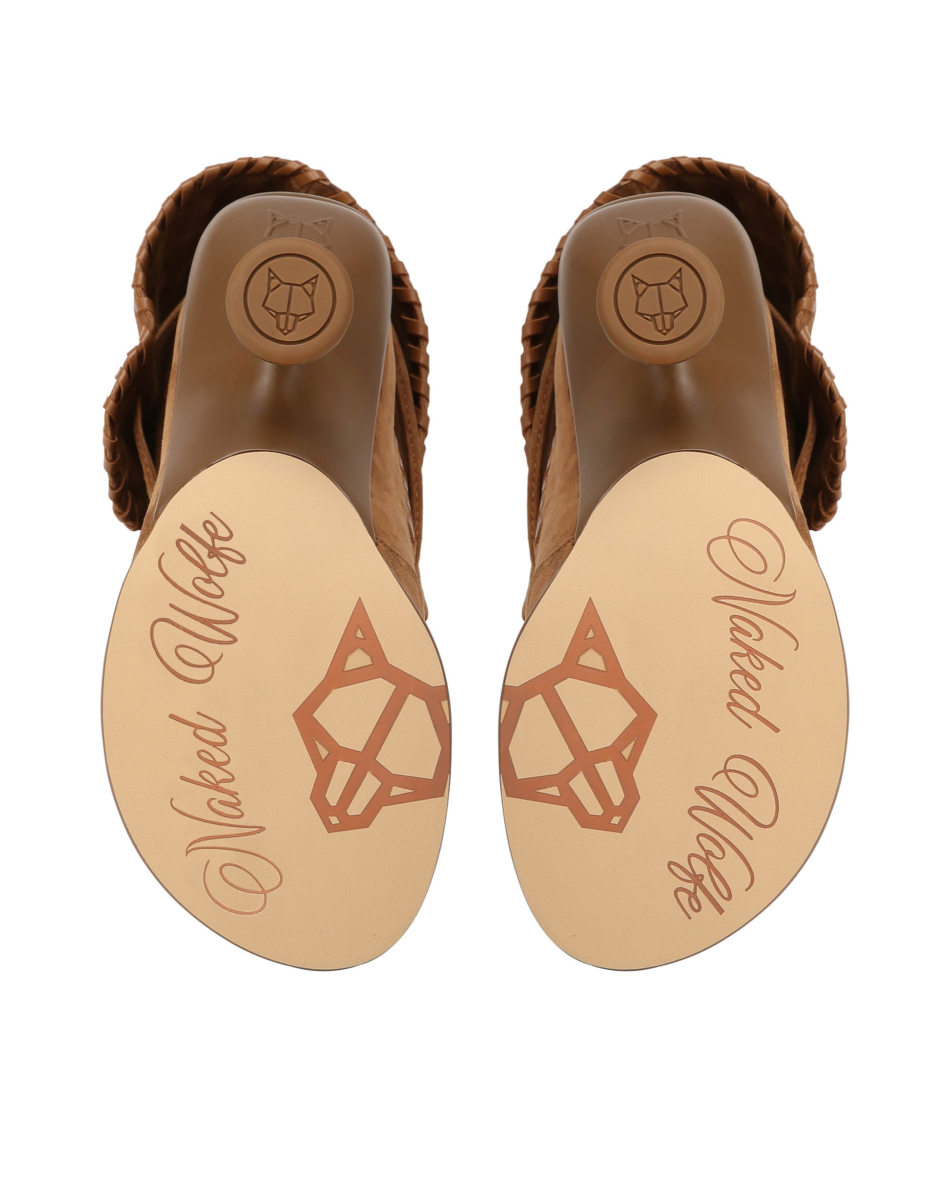 Introducing Bonnie, our new ankle boot with whip stitch detailing and beaded ties, available in tan suede. Featuring a striking 9cm custom Naked Wolfe heel and a round asymmetrical toe shape, these boots blend contemporary design with luxurious comfort, offering a unique twist on classic footwear. Perfect for making a bold fashion statement, they elevate any outfit with their distinctive silhouette and premium craftsmanship.