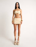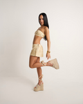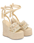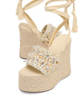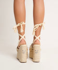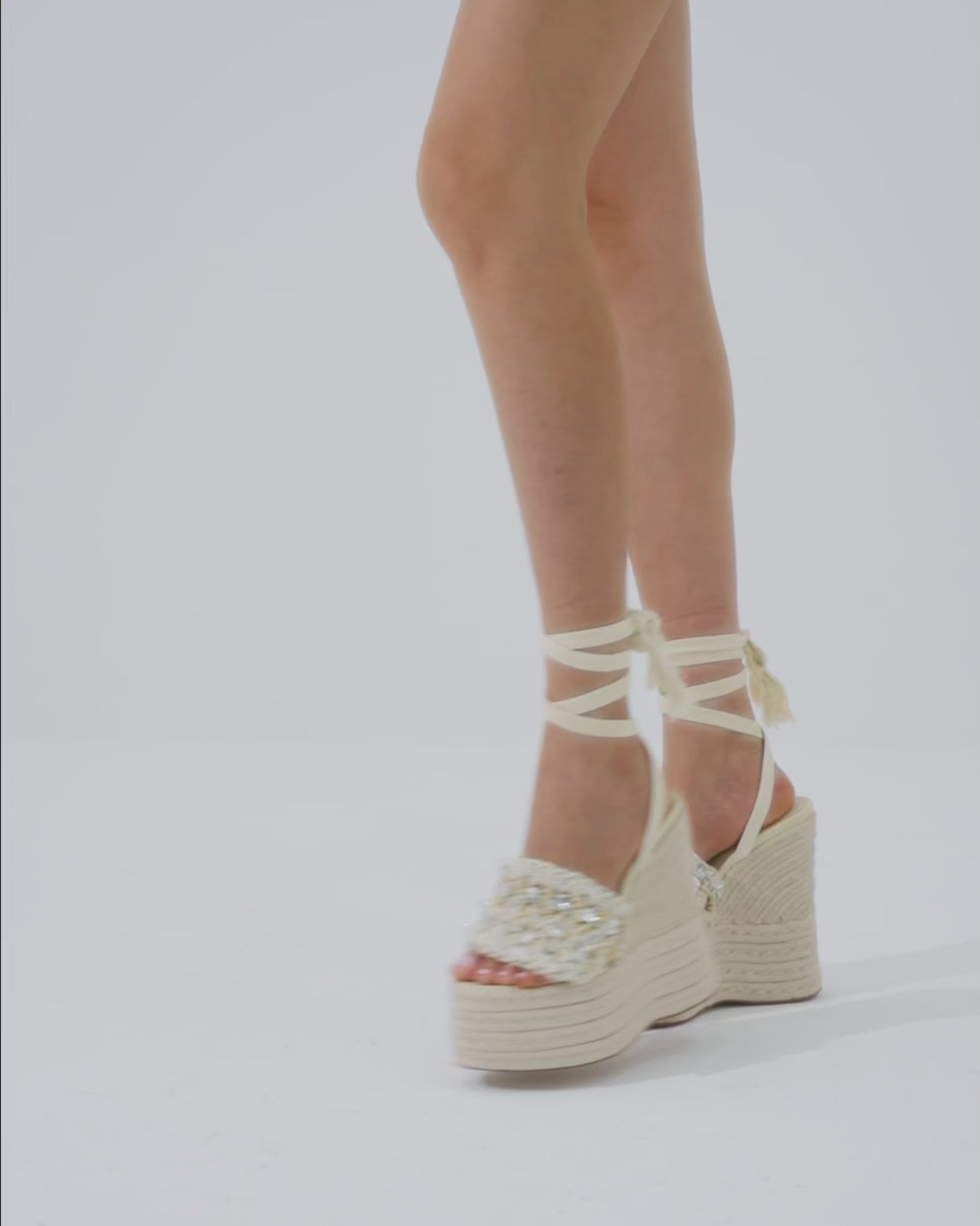Peony, our brand new summer wedge, features a woven rope upper design with hand sewn diamond embellishments and is perfect for any summer look. This mule upper is made of a natural rope and beaded combination, paired with a super soft and comfortable leg tie. The platform is wrapped in a natural espadrille rop