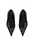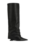 Elevate your style with Stated Black Leather boots. These luxurious boots feature a pointed 70mm heel height with a sprayed finish and a unique wolfe head design. The trouser leg detail adds a touch of sophistication to these exclusive boots. Made with premium black leather, they are the perfect statement piece for any outfit.