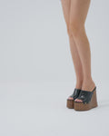 Tulip, our brand new wedged clog heel with a peep toe design is the perfect addition to any summer look. This mule upper is made of top grade luxury Italian leather. The platform is wrapped in a shiny cork wrap featuring the famous wolfe head plaque on the heel.
