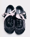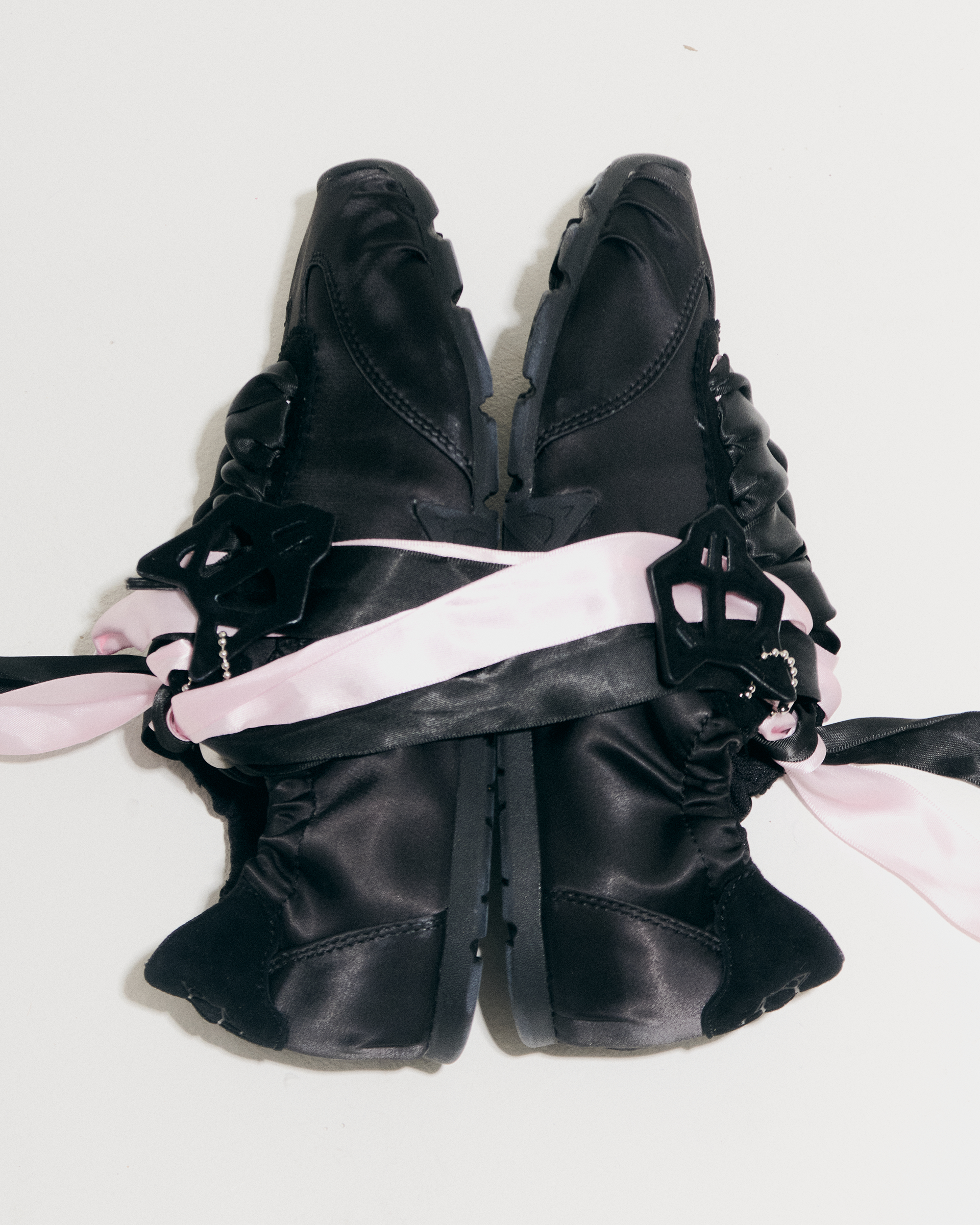 Meet Adorable: our stylish ballet sneaker blending silk satin and suede with a removable wolfe head logo. Features distinctive two-tone ribbon laces with extras included. Effortlessly chic in black satin. We recommend using our protective water and stain repellent to protect the fabric.
