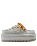 Introducing the Blizzard slip-on from Naked Wolfe, a backless shoe that combines luxury and modern comfort. Crafted from high quality distressed denim, it features a high quality leather lining and a leather sock for exceptional comfort. The shoe boasts a 60mm heel height and a chunky super light tread for an elevated look. Thick multi coloured laces, with an embossed logo and a big Wolfe head key chain en