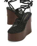 Iris, our brand new wedged clog heel is the perfect addition to any summer look. The upper is made of high quality woven fishnet and kid suede leg strap detail. The platform is wrapped in a shiny cork wrap featuring the famous wolfe head plaque on the heel.