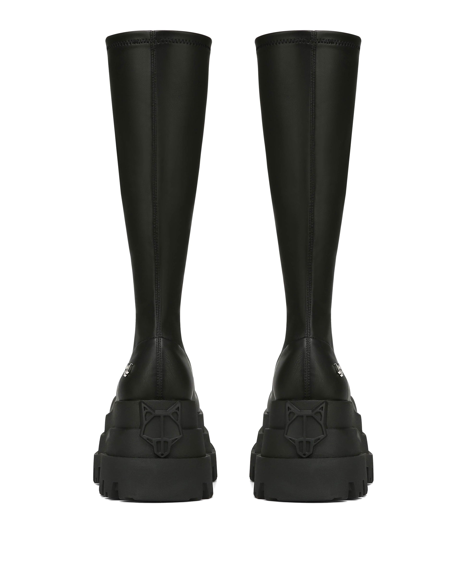Sin is a chunky platform boot made with a vegan friendly leg hugging stretch upper material. Sin is on a brand-new NW construction, which presents a mid-calf fitted upper pattern . Sin's construction features a three-tier platform with a bold square toe and an upper NW Wolfe head stud.