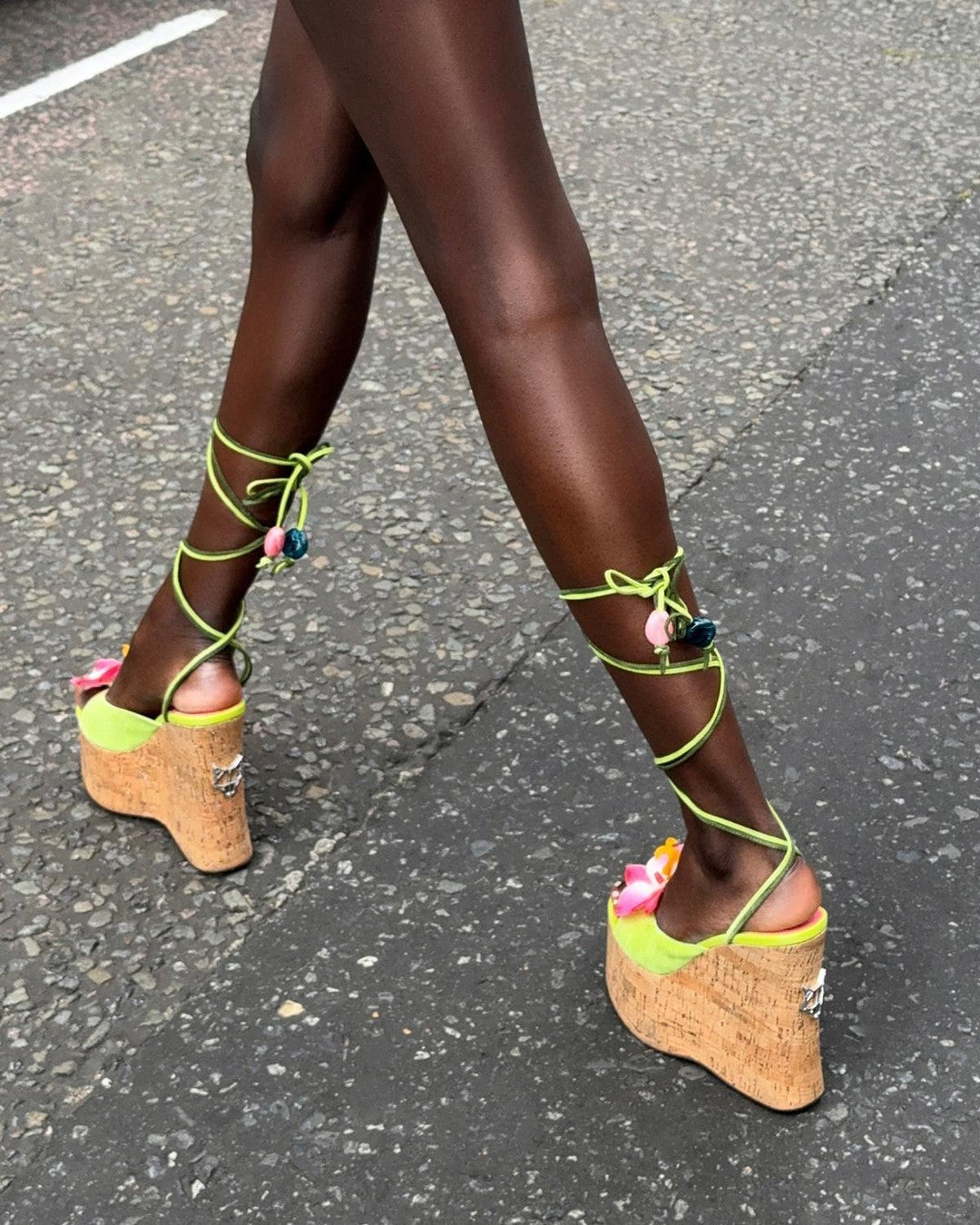 Sunflower our brand new wedged heel with a peep toe design perfect to complete a summer look. This style has a super cute soft green suede upper design with a striking pink flower, Summery ankle tie with a beaded finish to match and a Glitter cork wrap featuring the famous wolfe head plaque on the heel.