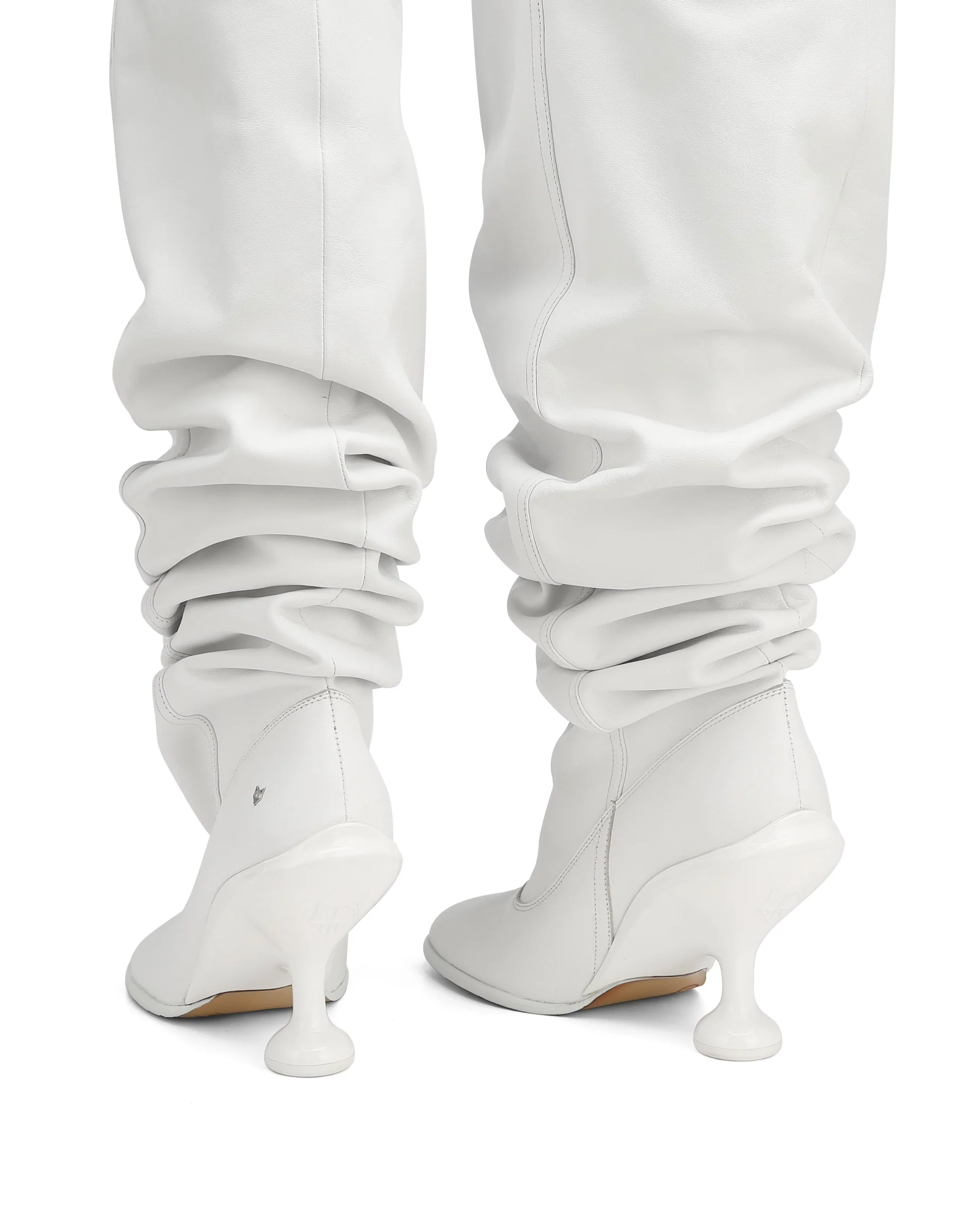 Boho, Embrace bold style with our Under-the-Knee Baggy Scrunch Boot in White Nappa Prince Leather, featuring a distinctive 9cm custom Naked Wolfe heel and a round asymmetrical toe shape. Crafted for those who love unique designs, these boots combine avant-garde flair with luxurious comfort. Perfect for making a fashion statement, they elevate any ensemble with their striking silhouette and premium leather craftsmanship.