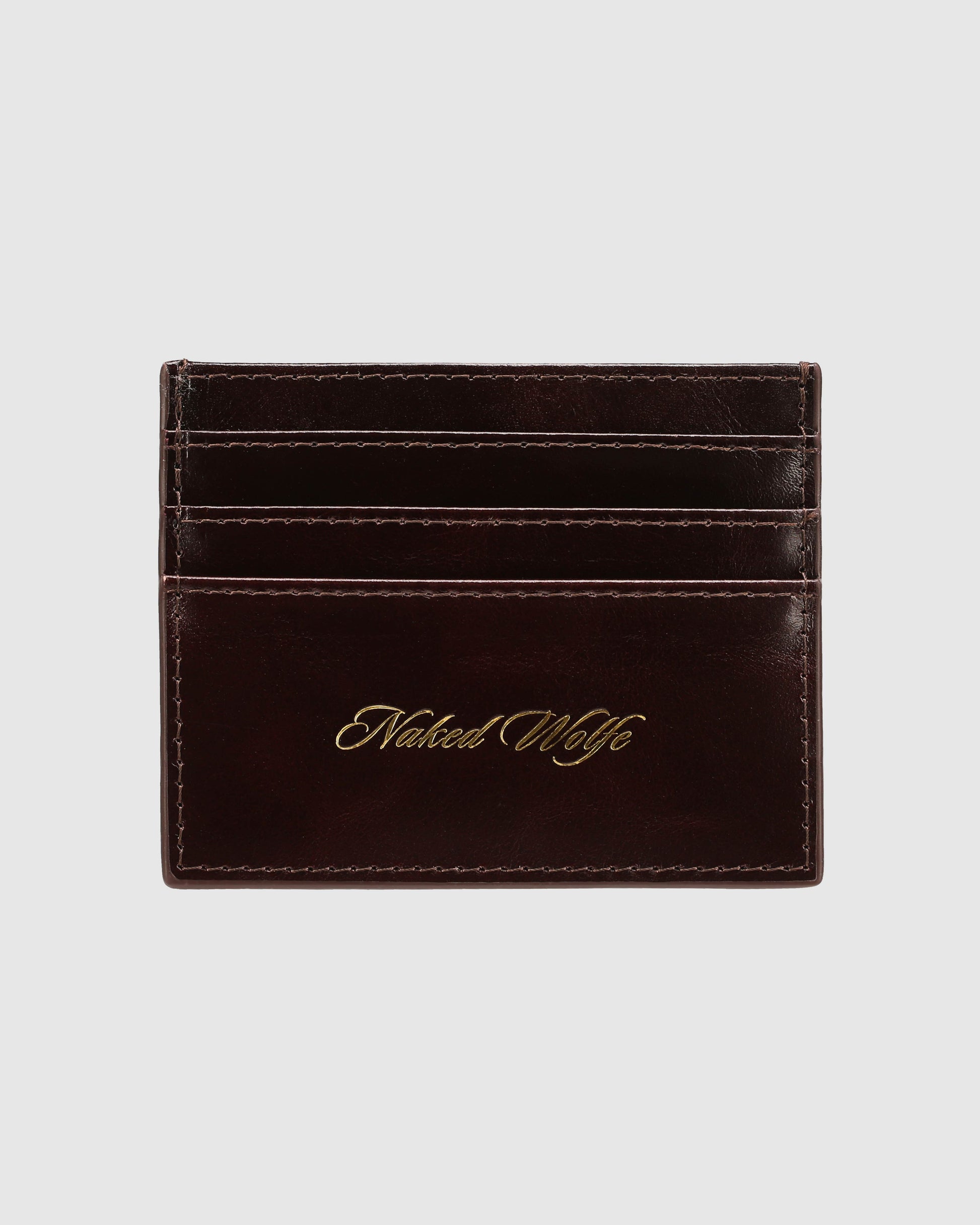 A compact card holder crafted from brown leather, designed for everyday use. The front is detailed with a subtle gold-foil Naked Wolfe logo for a refined touch. With multiple card slots and a slim profile, it’s an understated essential for any bag.