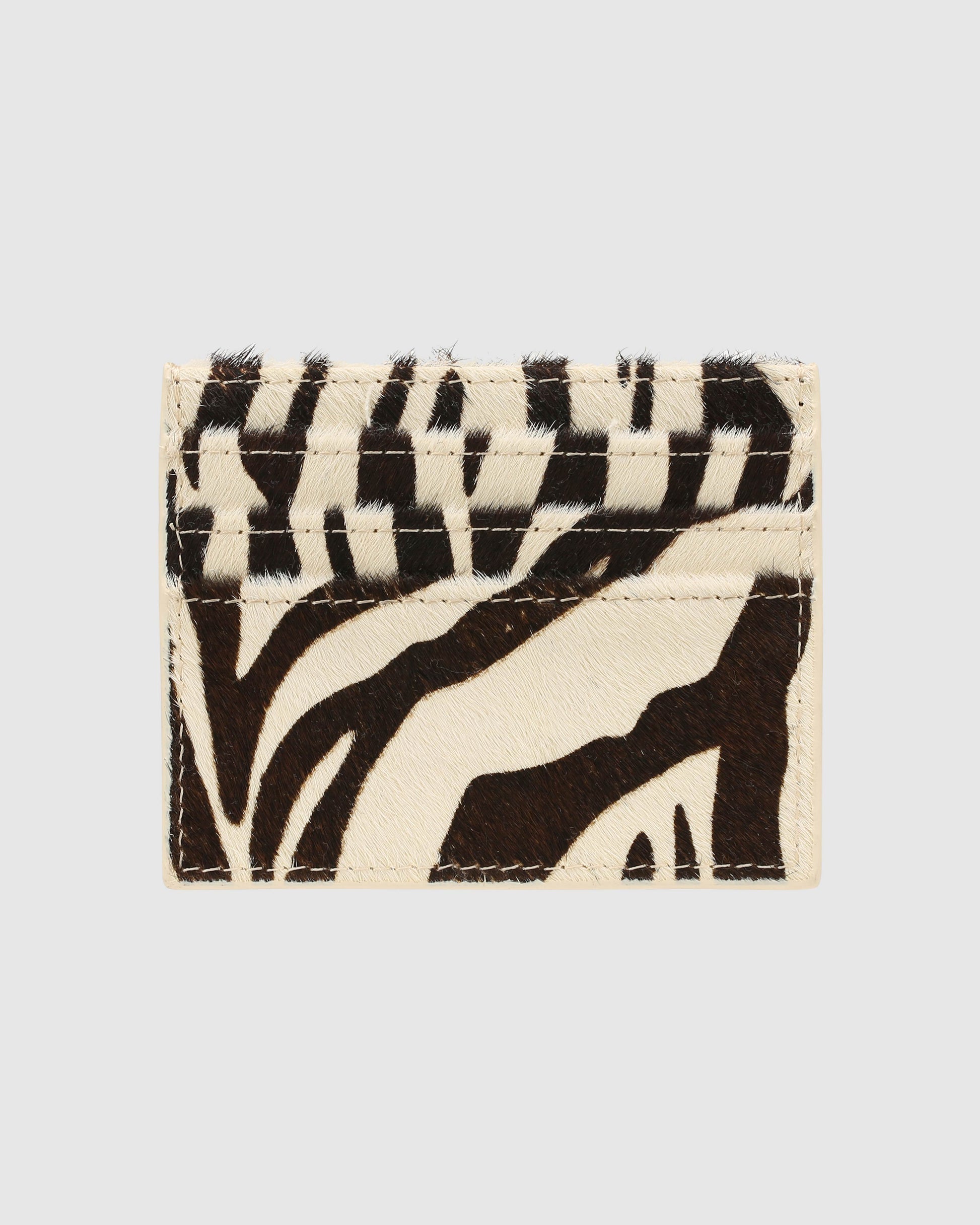 A compact card holder crafted from zebra pony hair, designed for everyday use. The front is detailed with a subtle gold-foil Naked Wolfe logo for a refined touch. With multiple card slots and a slim profile, it’s an understated essential for any bag.