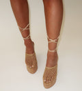 Iris, our brand new wedged clog heel is the perfect addition to any summer look. The upper is made of high quality woven fishnet and kid suede leg strap detail. The platform is wrapped in a shiny cork wrap featuring the famous wolfe head plaque on the heel.