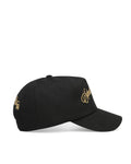 The newest addition to our expanding cap collection: The unconstructed 5 panel signature cap. With a custom embroidery logo on both back and front, this cap is made out of black canvas with gold logos. This one size fits all cap, features silhouette more tailored to men and adjustable popper strap at the back for a more tailored fit.