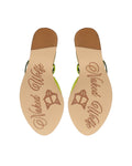 Sunflower our brand new wedged heel with a peep toe design perfect to complete a summer look. This style has a super cute soft green suede upper design with a striking pink flower, Summery ankle tie with a beaded finish to match and a Glitter cork wrap featuring the famous wolfe head plaque on the heel.
