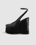 Tansy is our latest wedged heel, showcasing a sophisticated peep toe design. Crafted from premium luxury patent leather, this heel features a platform elegantly wrapped in matching patent leather and is finished with the renowned Wolfe head plaque on the heel for a refined statement.