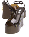 Tiger-Lilly, our brand new wedged clog heel with a peep toe design is the perfect addition to any summer look. This upper is made of top grade luxury Italian leather and perspex. The platform is wrapped in a shiny cork wrap featuring the famous wolfe head plaque on the heel.