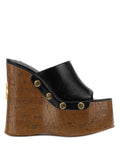 Tulip, our brand new wedged clog heel with a peep toe design is the perfect addition to any summer look. This mule upper is made of top grade luxury Italian leather. The platform is wrapped in a shiny cork wrap featuring the famous wolfe head plaque on the heel.