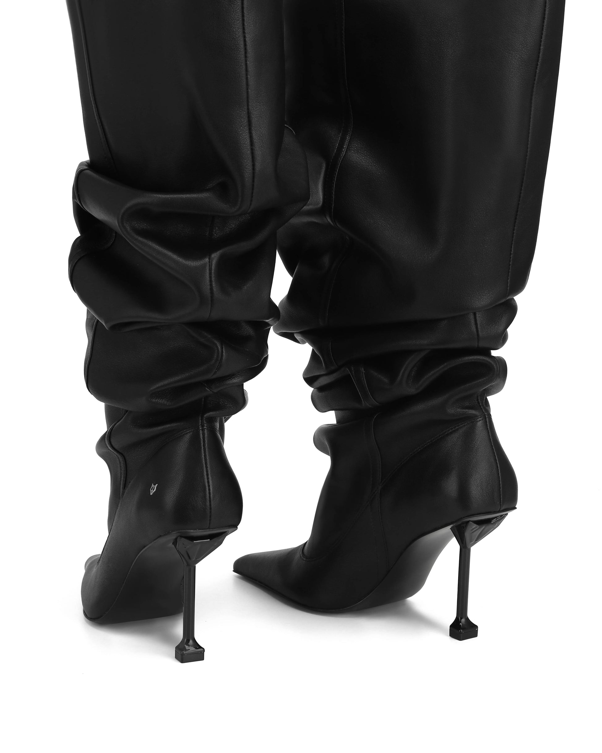 Introducing the Vern boot from Naked Wolfe, a striking pointed-toe heeled boot that exudes sophistication. Standing tall with a 9cm custom-made heel and featuring a unique Wolfe head design at the back, this boot is a true statement piece. The baggy scrunch boot leg design adds a touch of contemporary flair, while the small Wolfe head pin on the side