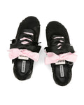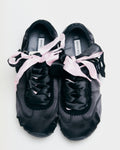 Meet Adorable: our stylish ballet sneaker blending silk satin and suede with a removable wolfe head logo. Features distinctive two-tone ribbon laces with extras included. Effortlessly chic in black satin. We recommend using our protective water and stain repellent to protect the fabric.