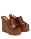 Tulip, our brand new wedged clog heel with a peep toe design is the perfect addition to any summer look. This mule upper is made of top grade luxury Italian leather. The platform is wrapped in a shiny cork wrap featuring the famous wolfe head plaque on the heel.