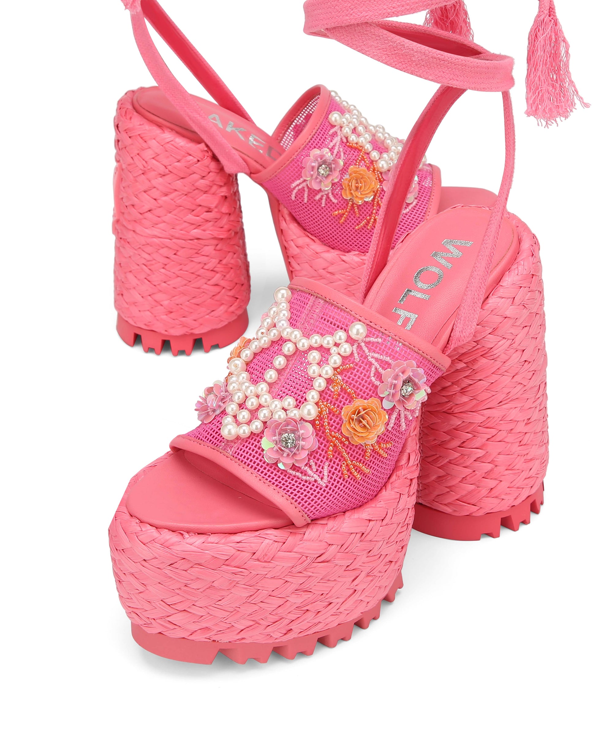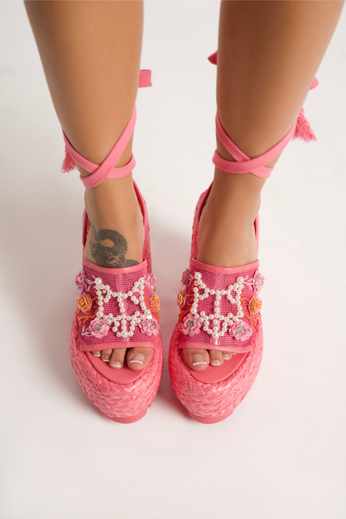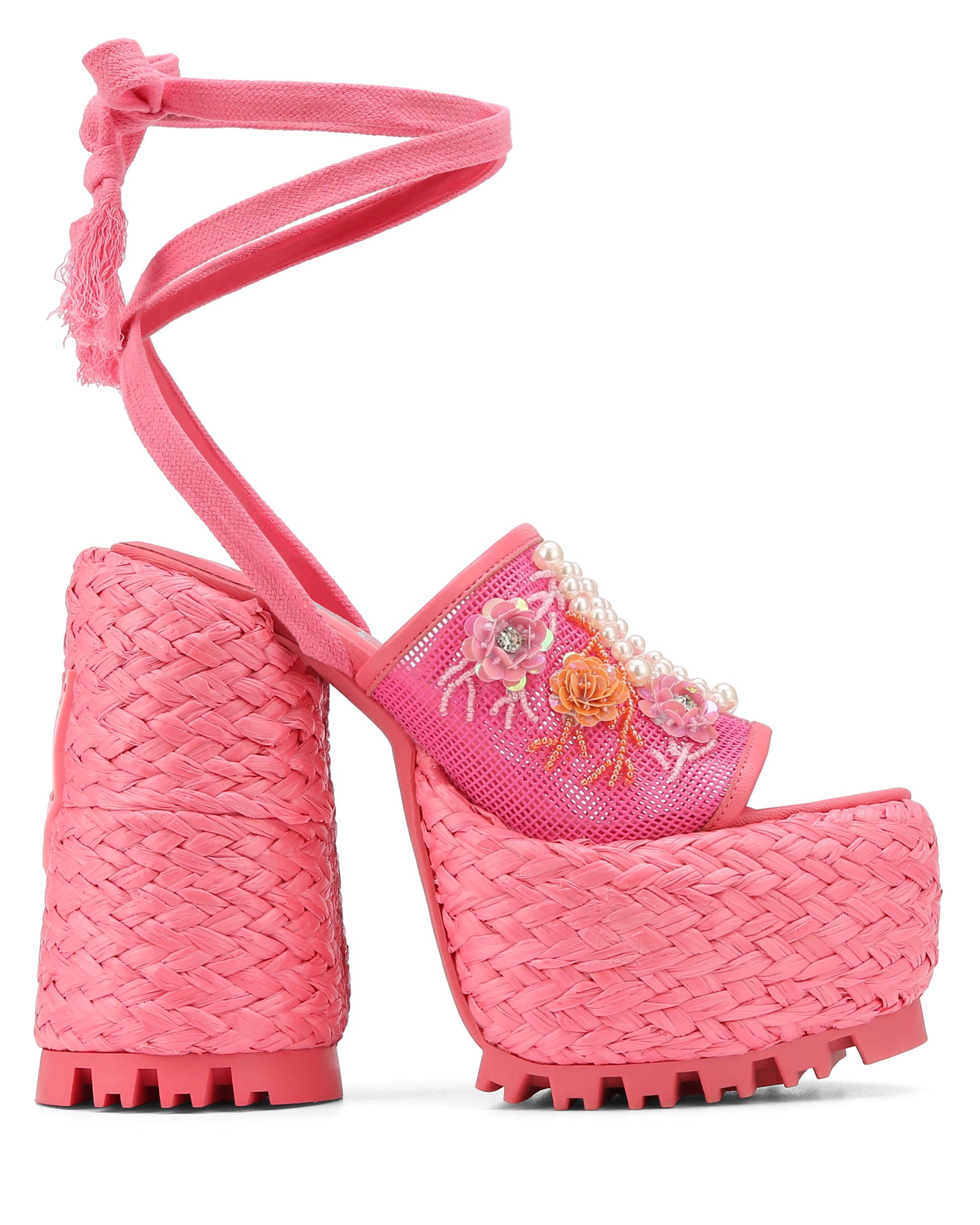 Bluebell is our brand new inflated heel, with a new toe shape for an elegant look. This style features a super cute mesh upper design with pearls, embellishments, and a summery ankle tie with a padded heel platform to match in raffia. This style also features the famous wolfe head plaque on the heel.