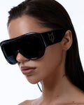 Discover the Kim Black Sunglasses, the latest refined addition to our curated collection. These distinguished oversized frames feature immaculate black acetate construction paired with sophisticated black lenses. Each temple is elegantly adorned with our iconic Wolfe head foil emblem—a mark of exceptional quality. Meticulously crafted from premium acetate and offering complete UV protection, these sunglasses seamlessly blend bold aesthetics with superior functionality for the discerning individual.