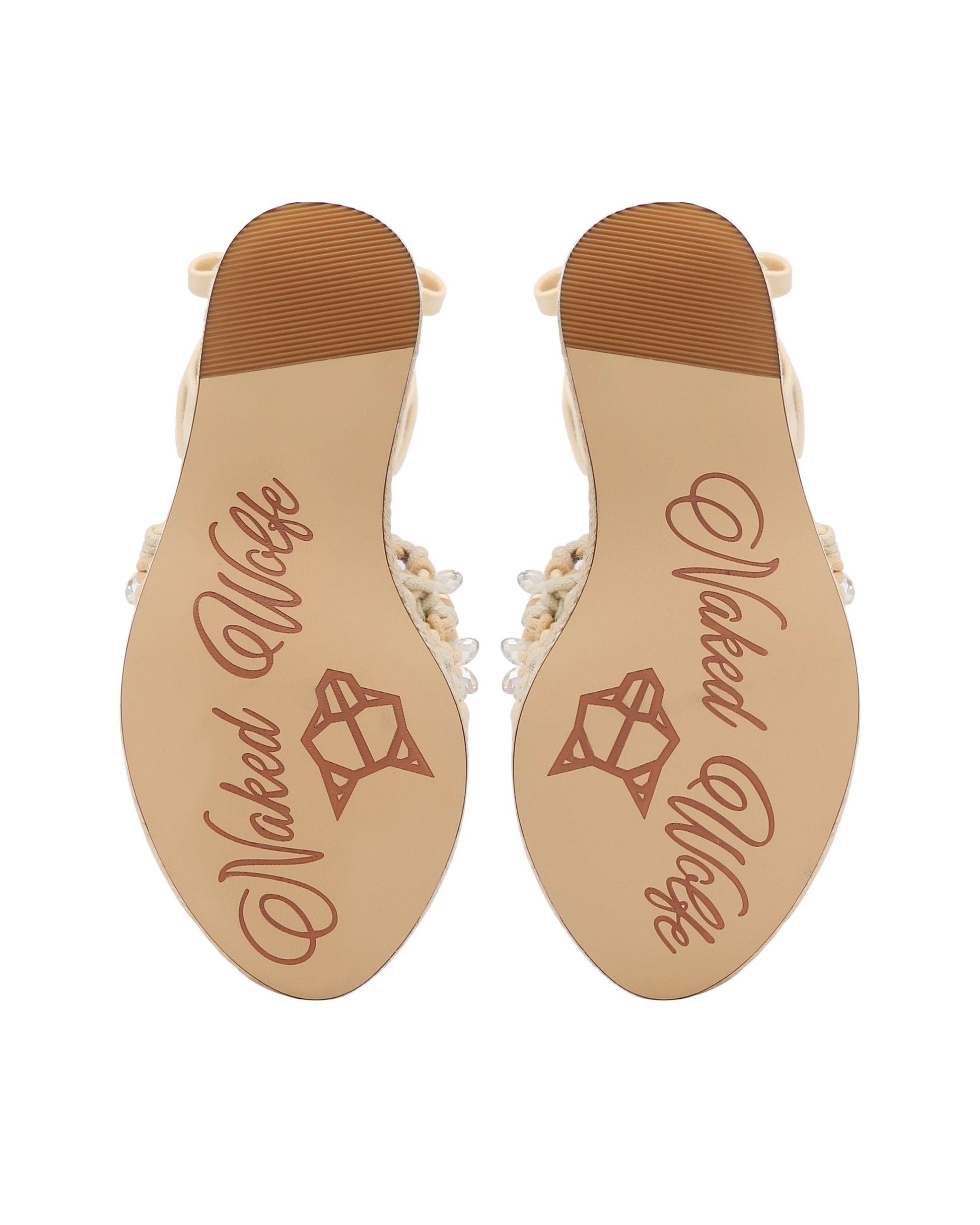Peony, our brand new summer wedge, features a woven rope upper design with hand sewn diamond embellishments and is perfect for any summer look. This mule upper is made of a natural rope and beaded combination, paired with a super soft and comfortable leg tie. The platform is wrapped in a natural espadrille rope featuring the famous wolfe head plaque on the heel.