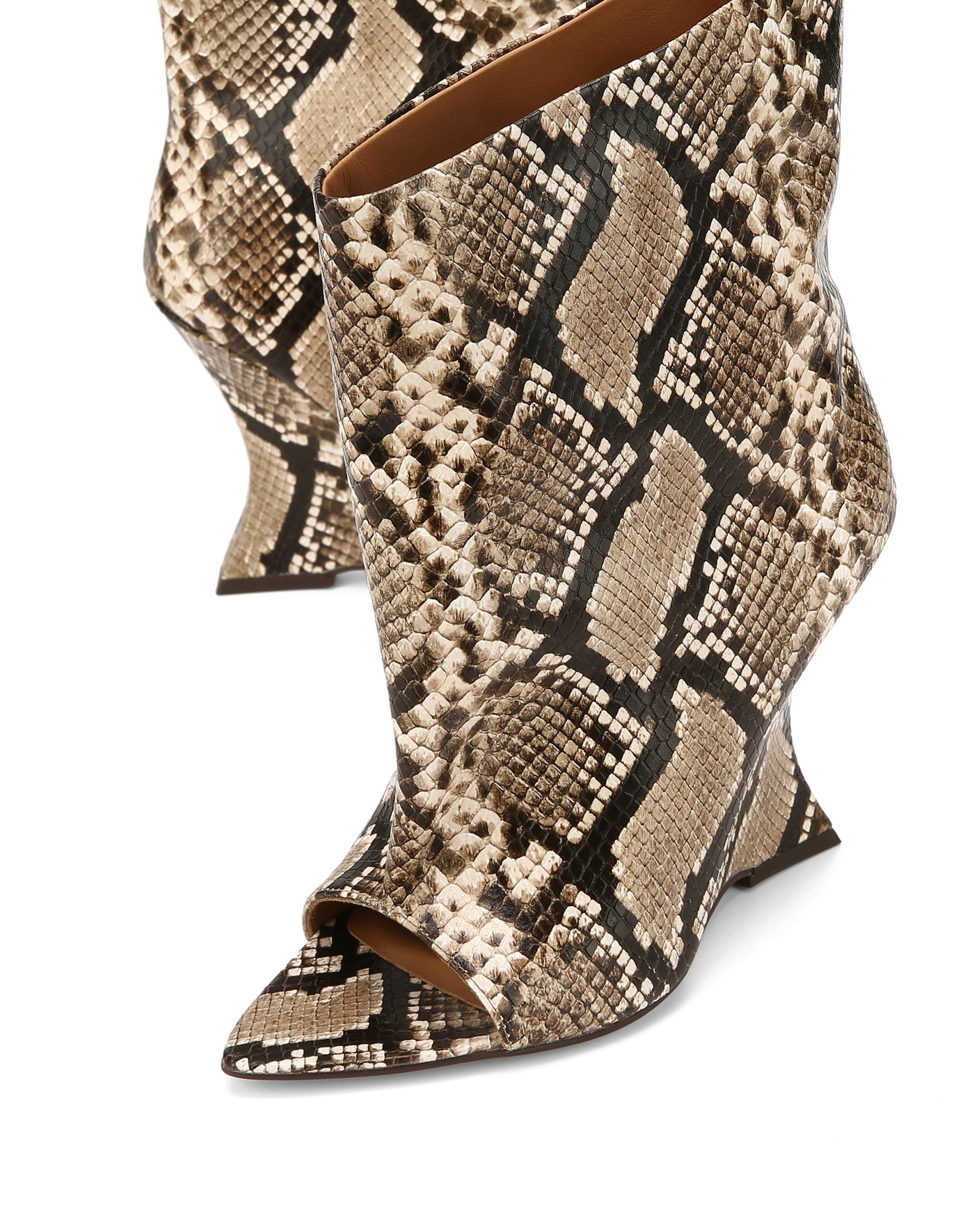 Reptile is an above-ankle boot with a peep toe, defined by sharp precision and modern texture, with its asymmetric topline. A pointed toe and snake print upper set against a 150mm heel height that feels both architectural and understated.