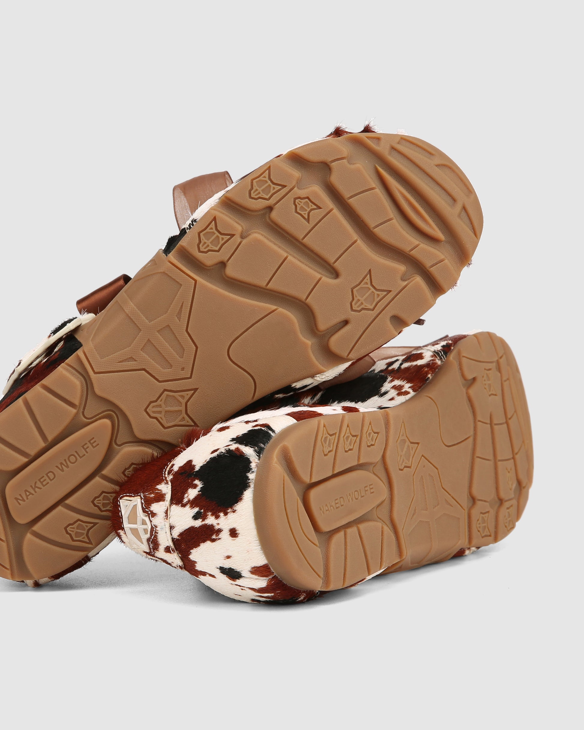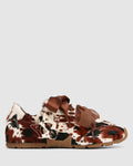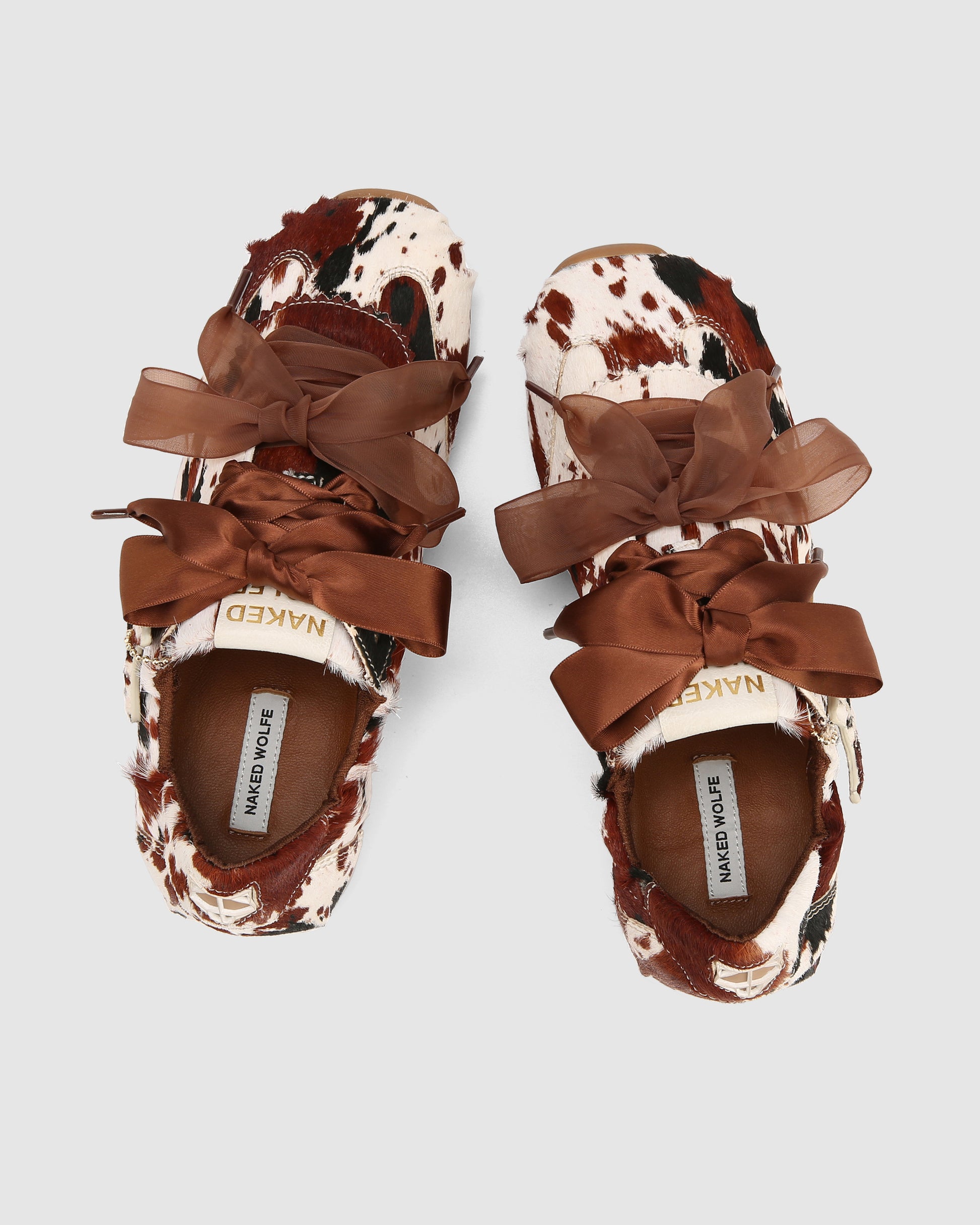 Meet Adorable: our stylish ballet sneaker in cow print calf hair with a removable wolfe head logo. Features distinctive two-tone ribbon and chiffon laces with extras included. We recommend using our protective water and stain repellent which can be purchased.