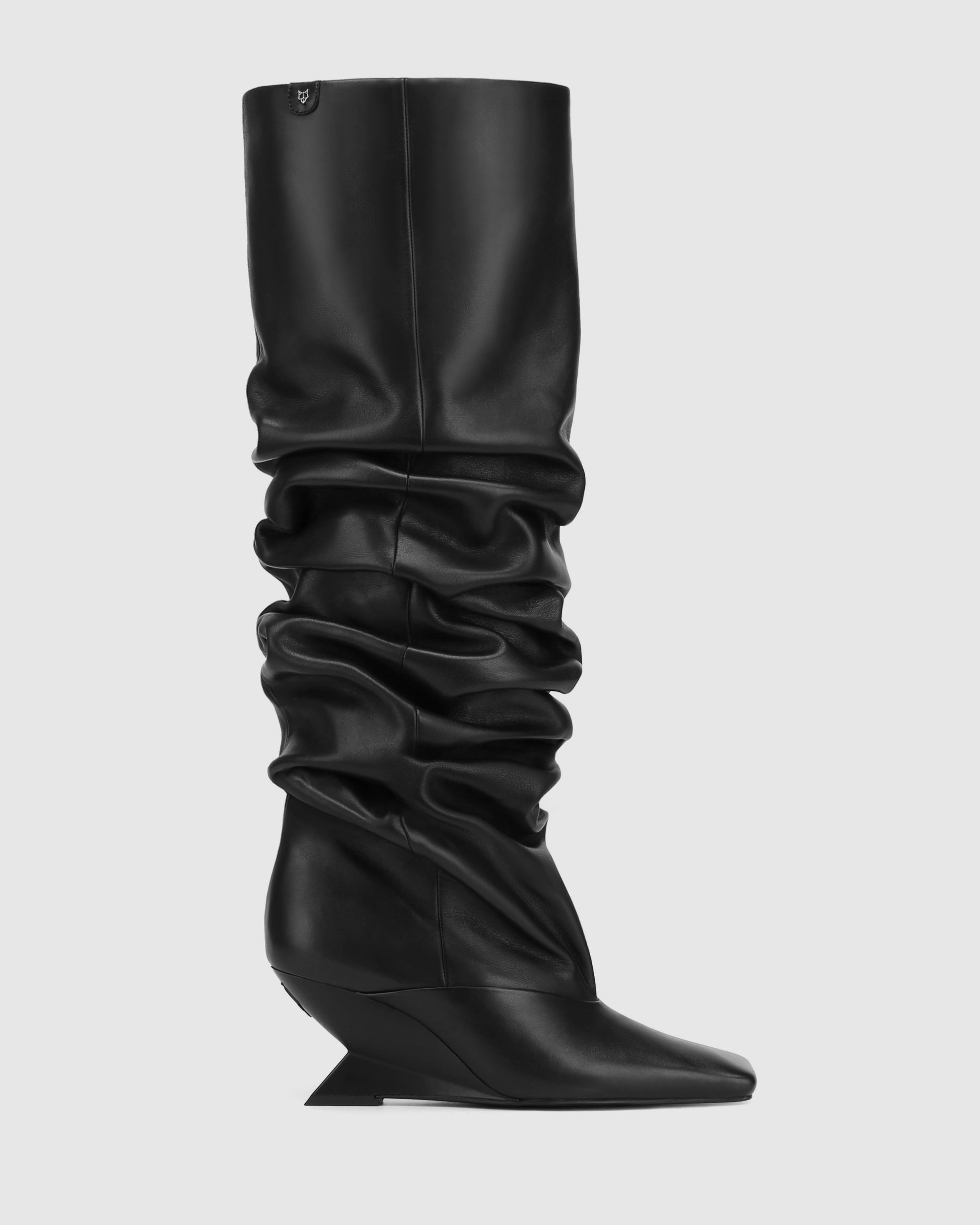 Meet Allie, our latest under-the-knee boot featuring a tapered square toe and an expertly sewn scrunch detail in soft leather. It rests on a 70mm heel and is enhanced with a sprayed semi-matte finish for an understated yet luxurious appeal.
