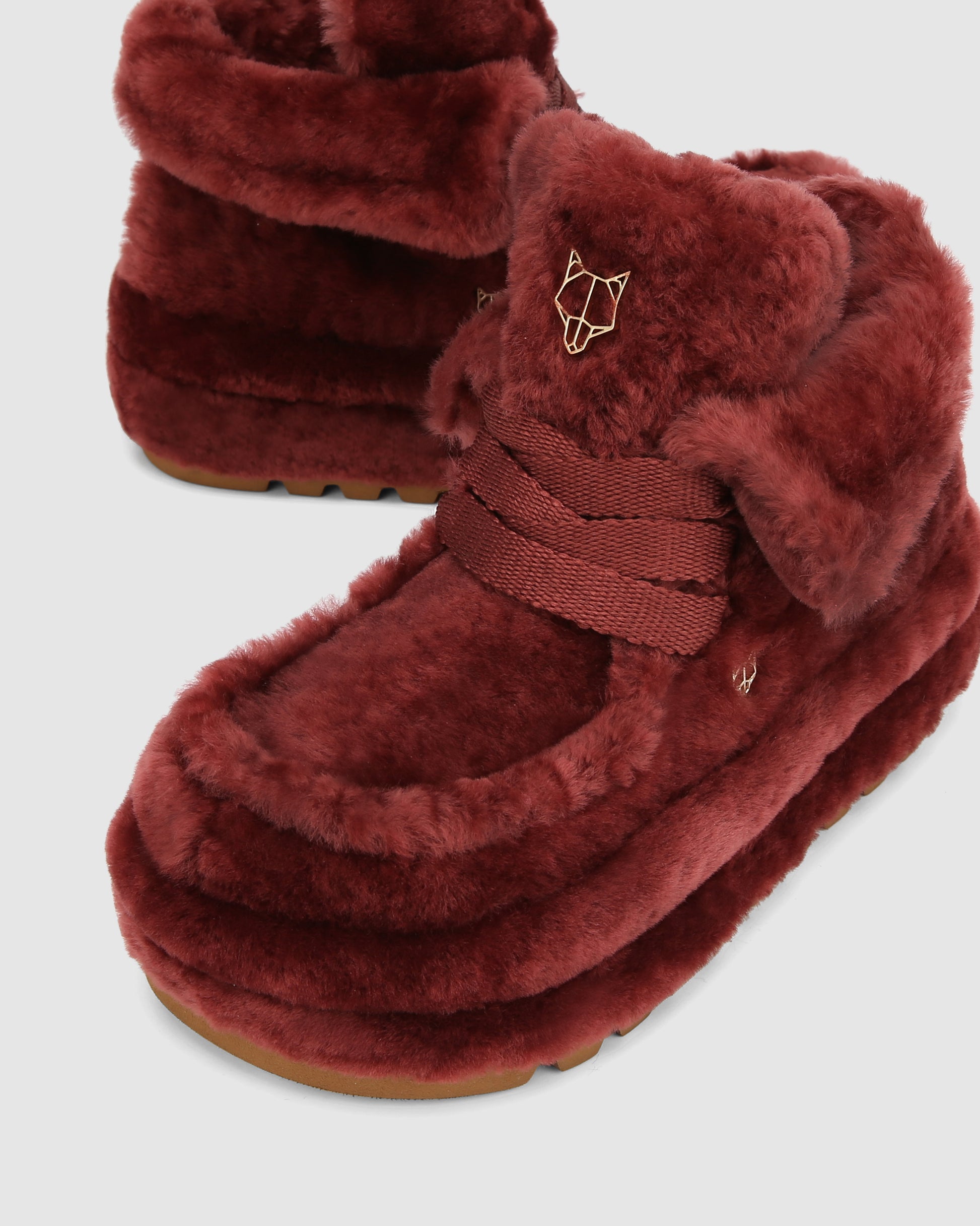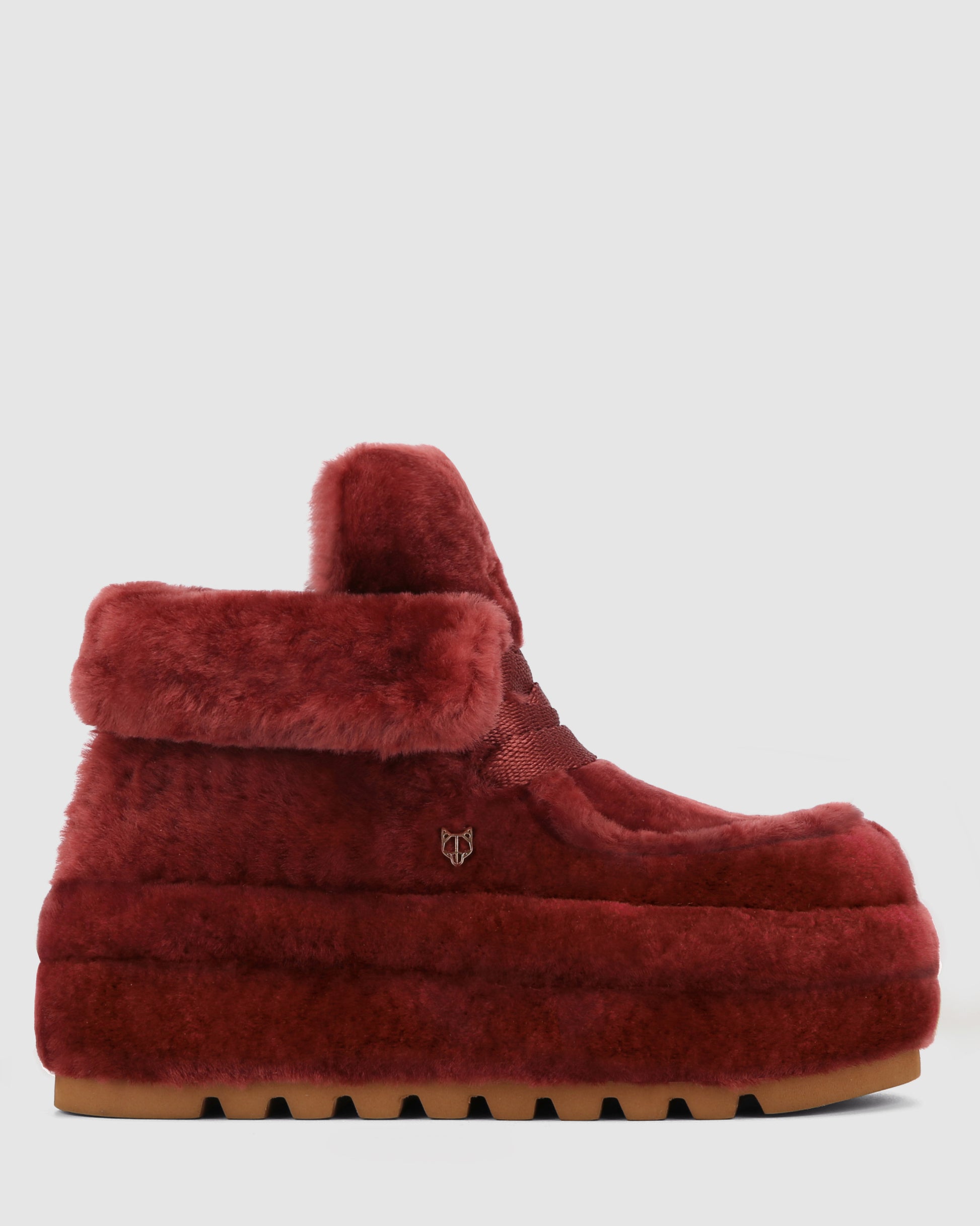 Bambi, the new boot from Naked Wolfe, a perfect blend of luxury and edge. This boot features a premium shearling wool, ideal for colder weather. With a 60mm heel height and a chunky super light tread. The design is enhanced by 15mm width laces, an embossed Wolfe head on the tongue, and an embossed logo on the back tape. A small Wolfe head pin at the side adds a distinctive touch, making the Bambi boot a standout piece in any winter wardrobe.