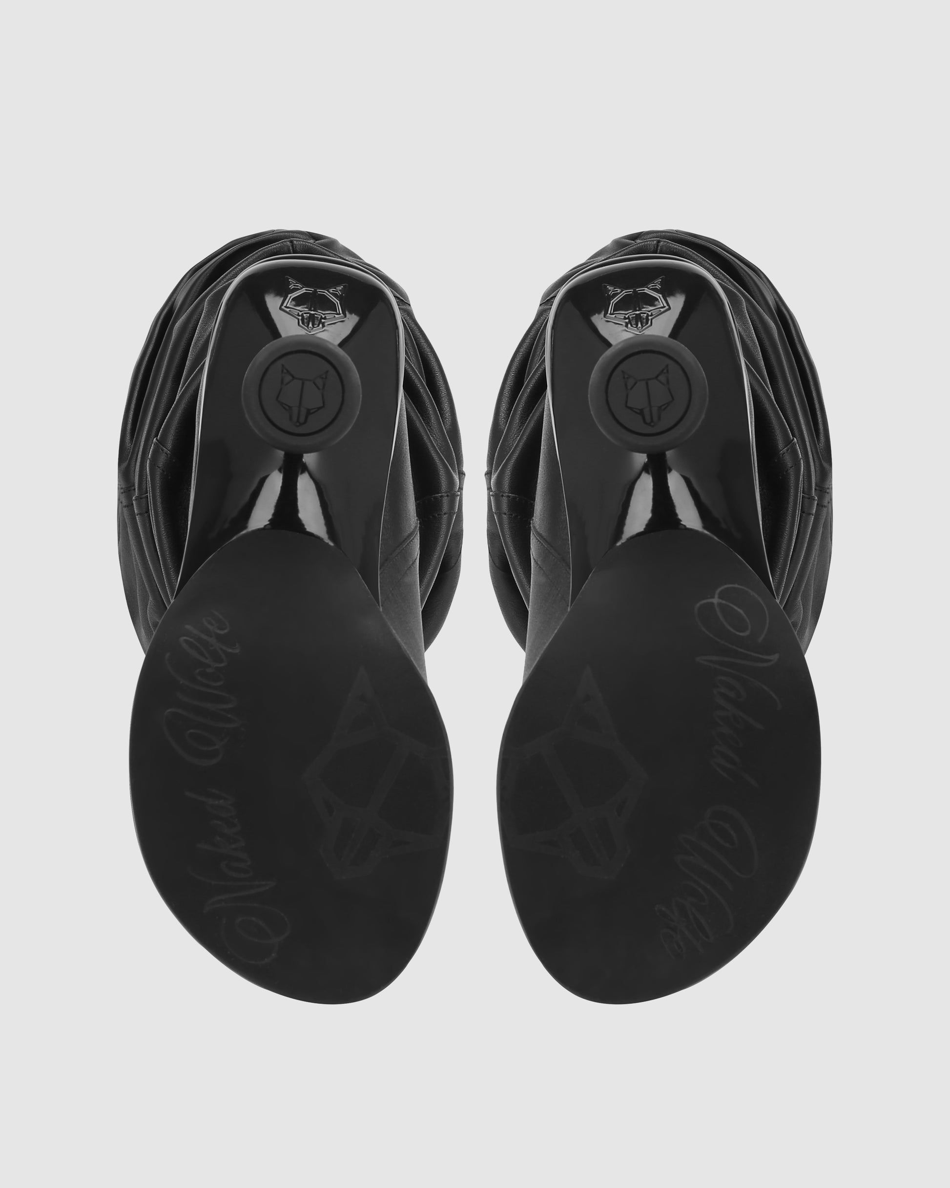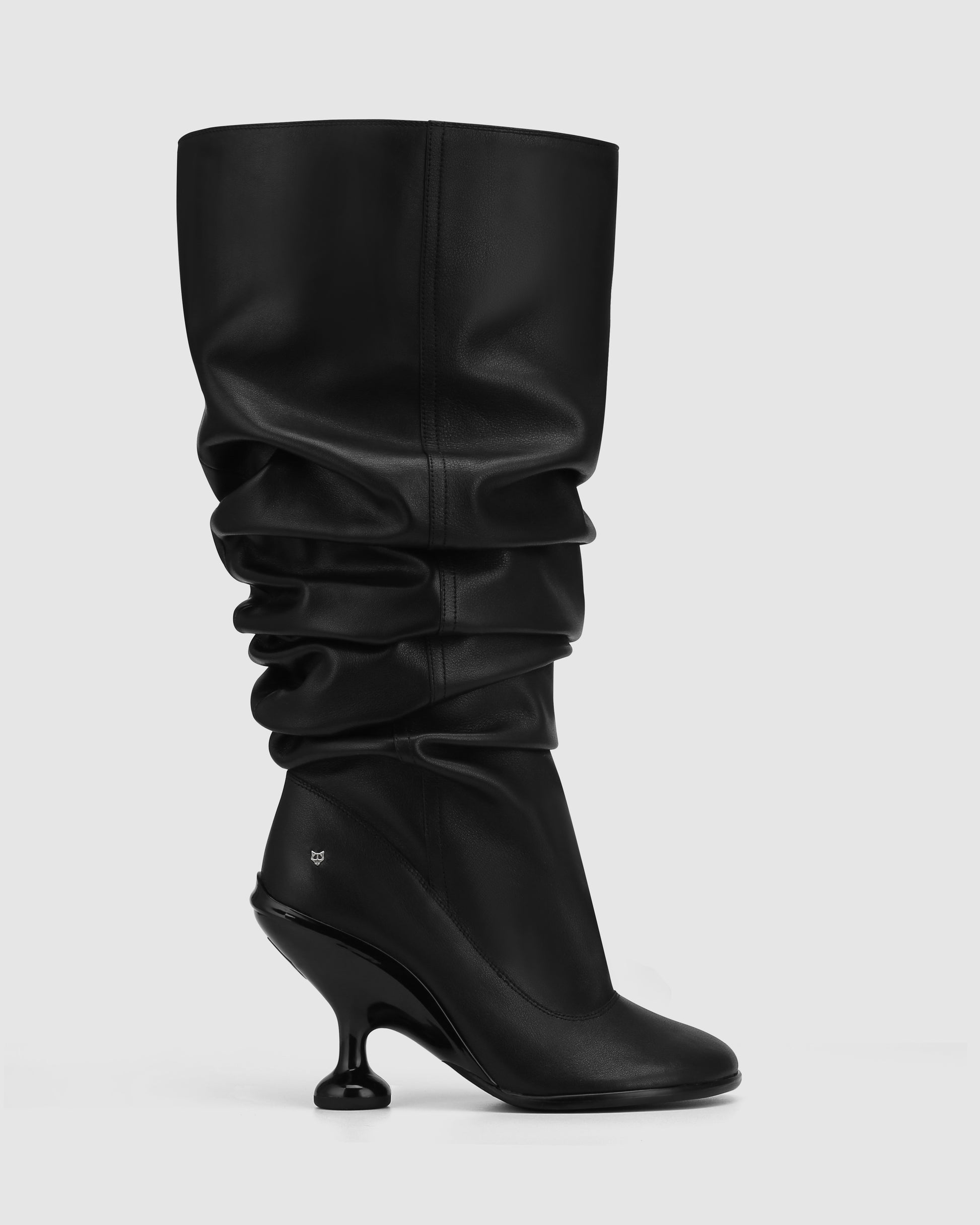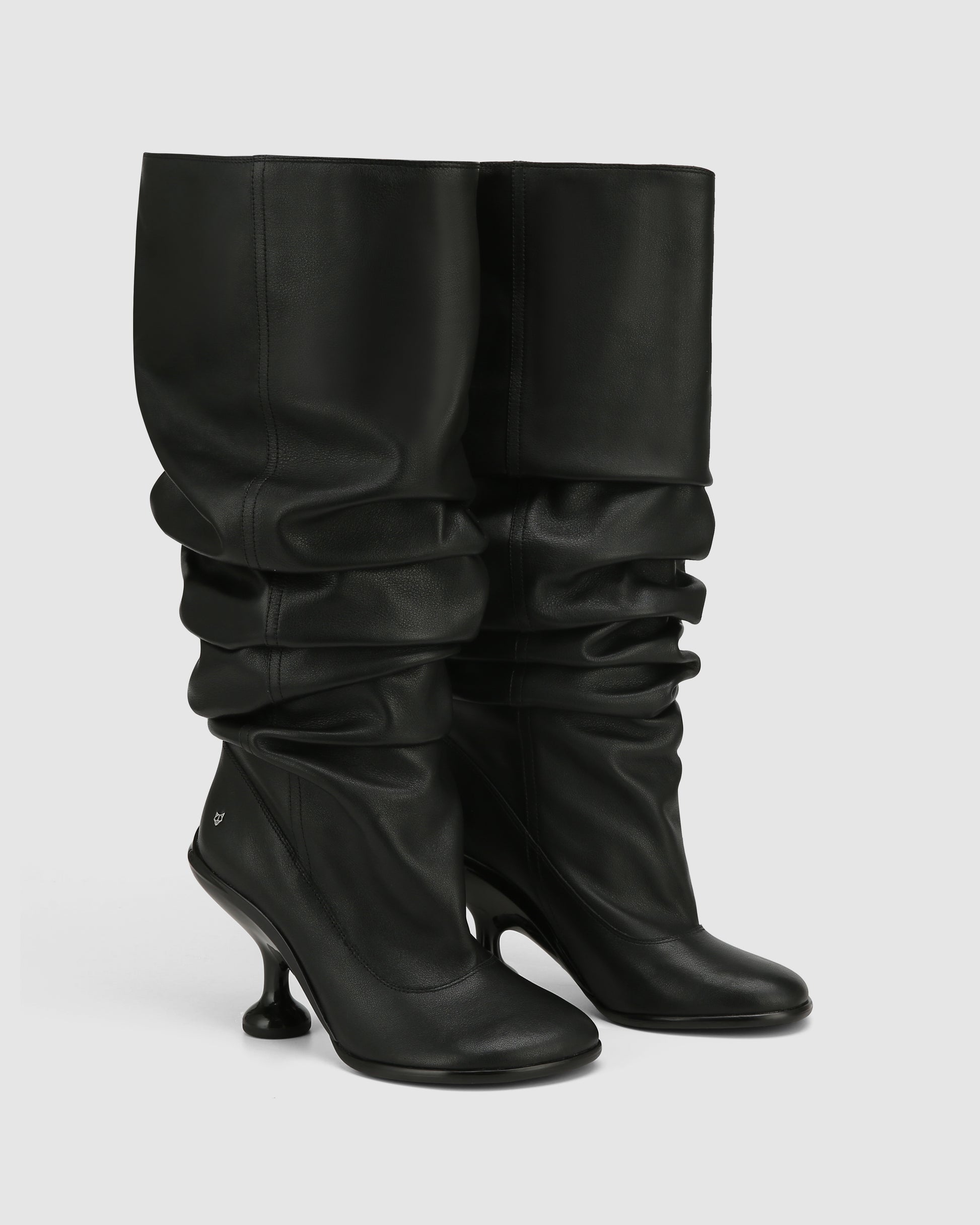 Boho, Embrace bold style with our Under-the-Knee Baggy Scrunch Boot in White Nappa Prince Leather, featuring a distinctive 9cm custom Naked Wolfe heel and a round asymmetrical toe shape. Crafted for those who love unique designs, these boots combine avant-garde flair with luxurious comfort. Perfect for making a fashion statement, they elevate any ensemble with their striking silhouette and premium leather craftsmanship.