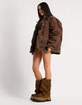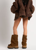 Introducing Disturb, the chunky boot of the season with an asymmetric toe shape, designed for those who appreciate bold fashion statements. This boot features a wide leg fit, complemented by a distinctive Wolfe head ball charm for added flair. It also includes new rubber toe and heel pieces, combining durability with a modern aesthetic. Each pair has a hand crafted dirty finish. Perfect for trendsetters seeking both edge and elegance, this boot is a must-have for any fashion-forward wardrobe.
