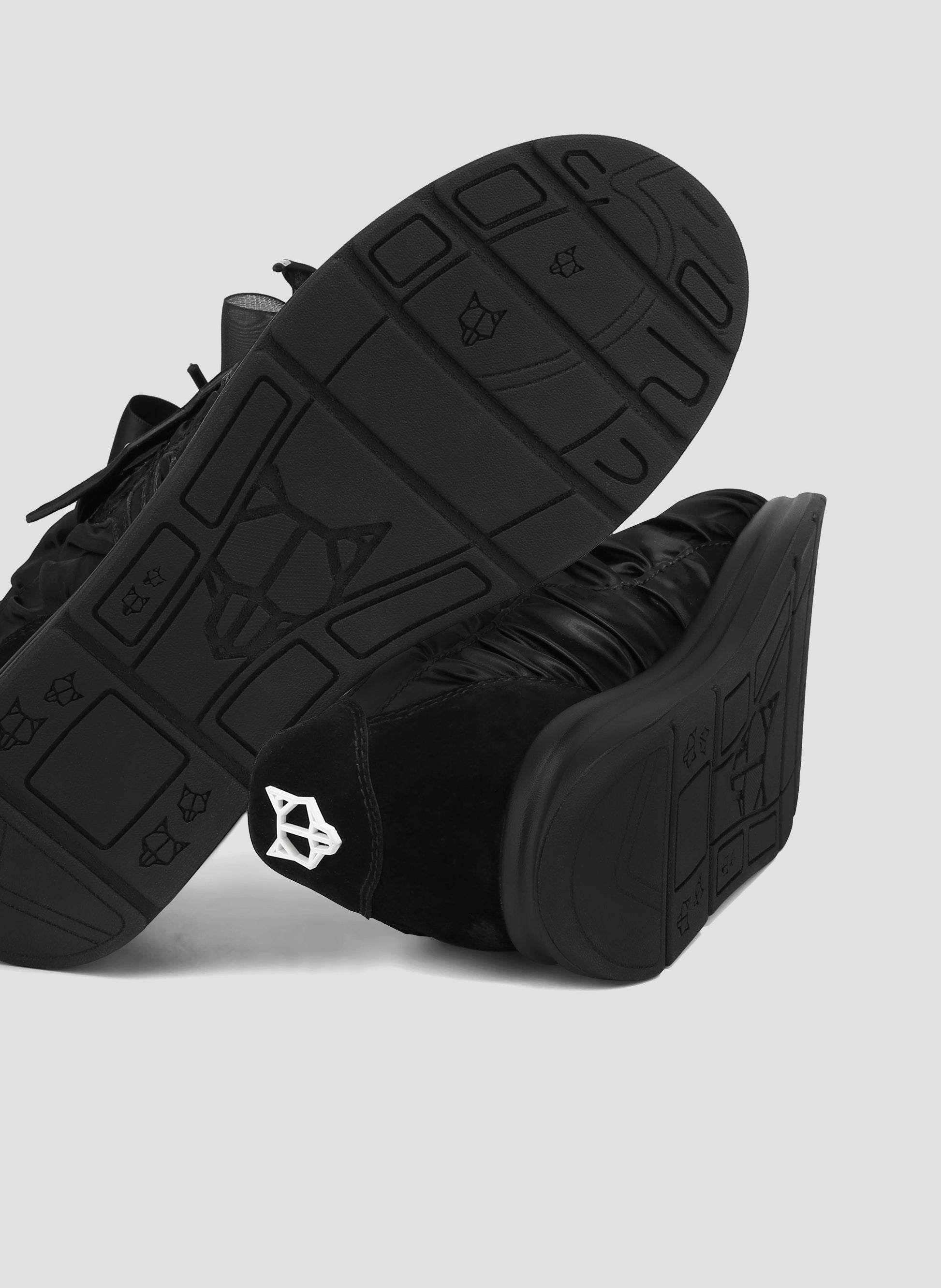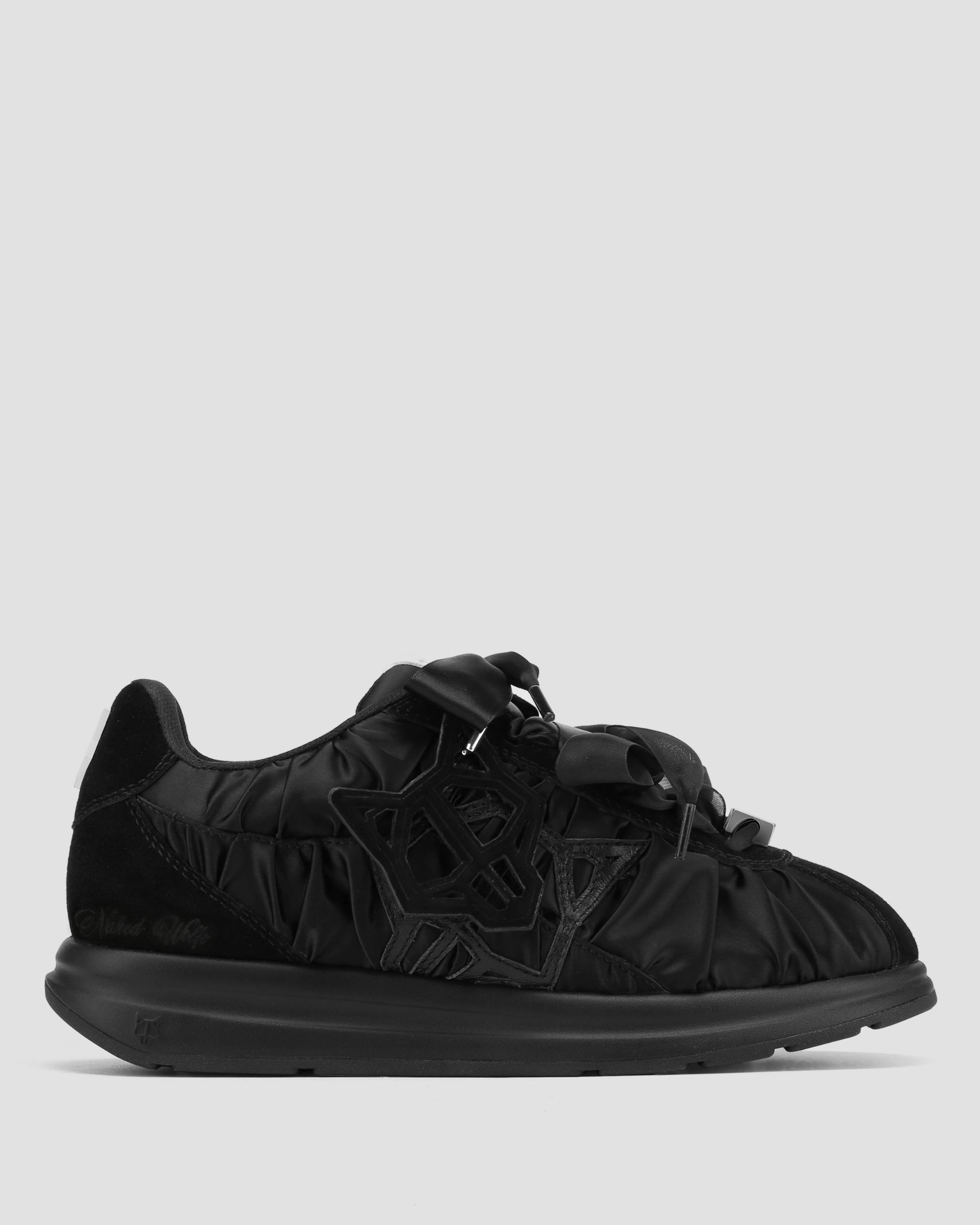 Engineered for impact. The Expensed sneaker features a precision-cut satin scrunch and suede upper paired with a leather logo and detachable Wolfe head patch for modular styling. Double ribbon laces offer a structured fit, while a breathable mesh lining and custom-moulded sock design enhance comfort and airflow. Finished in an all black colour way, it sits on a high-performance PU and rubber outsole with integrated Naked Wolfe branding for traction and durability.