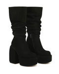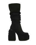 Space, the newest most desirable scrunch boot. Space is based on a show stopping exaggerated round toe shape. Made from the finest suede, this boot is not one to be missed. Space features an inside leg zip to make the fitting perfect. Space is made up of a padded platform and heel which embeds the iconic Naked Wolfe wolfe head plaque.