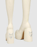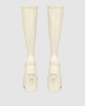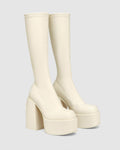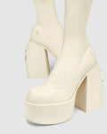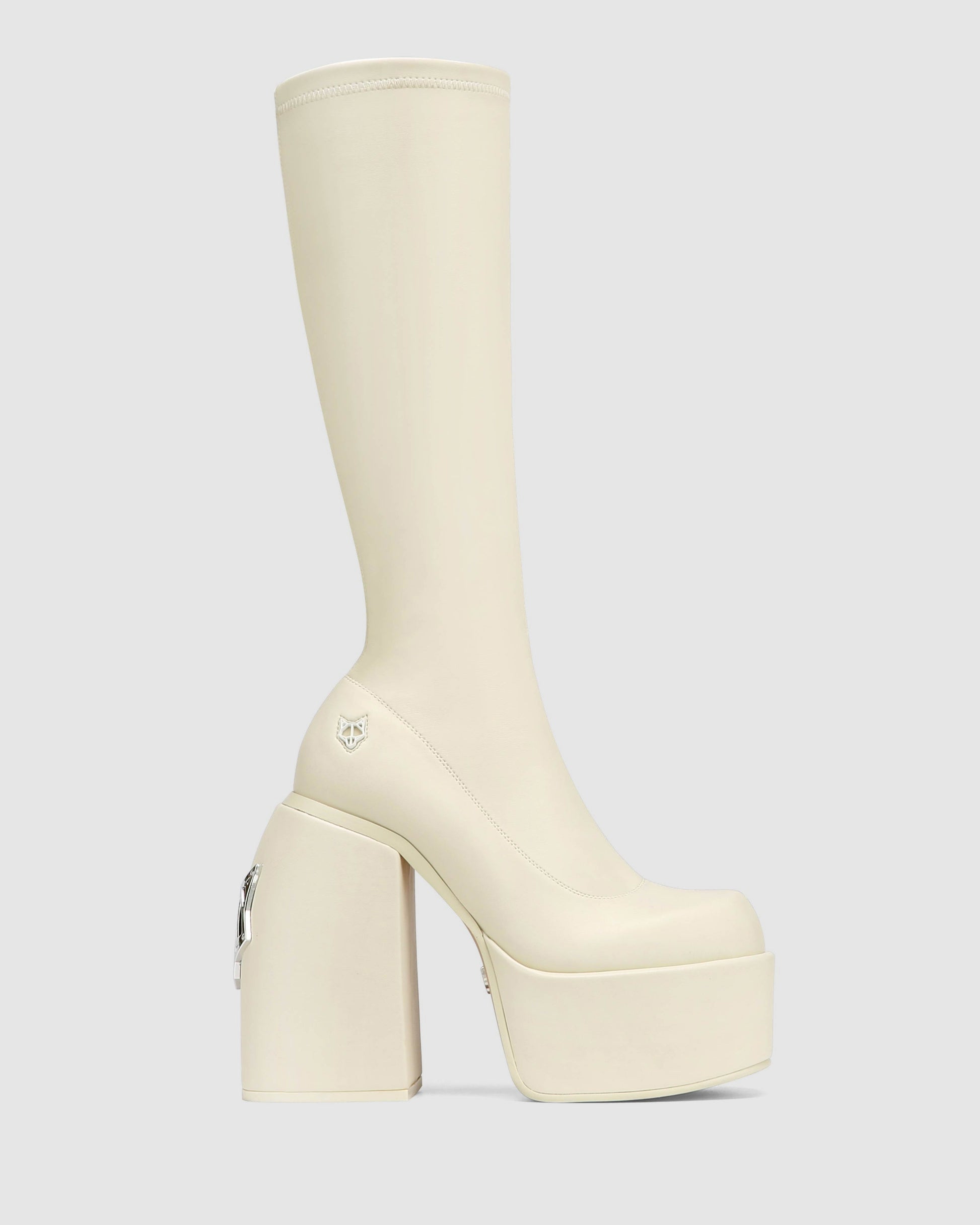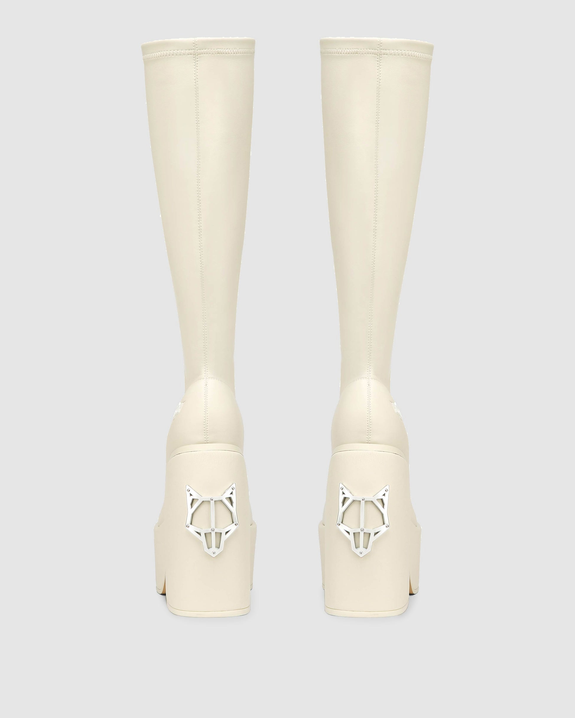 Under the knee skin hugging platform 90’s inspired boot made with a vegan friendly leg hugging stretch upper material on a custom designed Naked Wolfe platform and heel construction. Featuring our Naked Wolfe “wolfe” head plaque on the heel and a metal “wolfe” head plaque embedded into the heel.