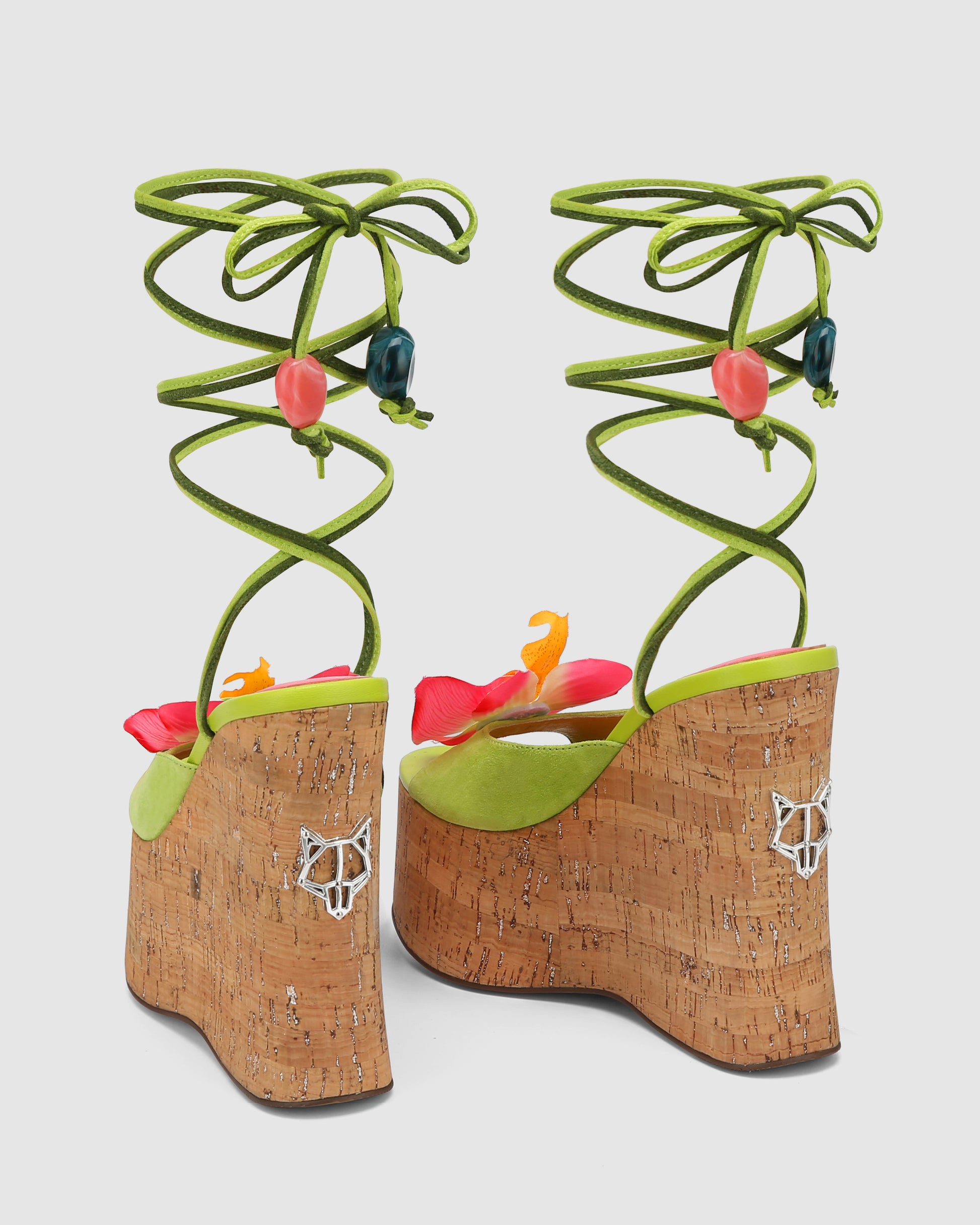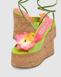 Sunflower our brand new wedged heel with a peep toe design perfect to complete a summer look. This style has a super cute soft green suede upper design with a striking pink flower, Summery ankle tie with a beaded finish to match and a Glitter cork wrap featuring the famous wolfe head plaque on the heel.