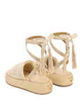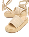 Surf, the new flat sandal, is made from high quality raffia on a sheep leather insole. The construction is wrapped in raffia with a custom designed resin bottom. The upper logo is our statement wolfe head in a diamond design.Features