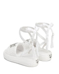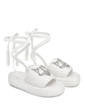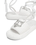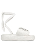 Surf, the new flat sandal, is made from high quality raffia on a sheep leather insole. The construction is wrapped in raffia with a custom designed resin bottom. The upper logo is our statement wolfe head in a diamond design.Features