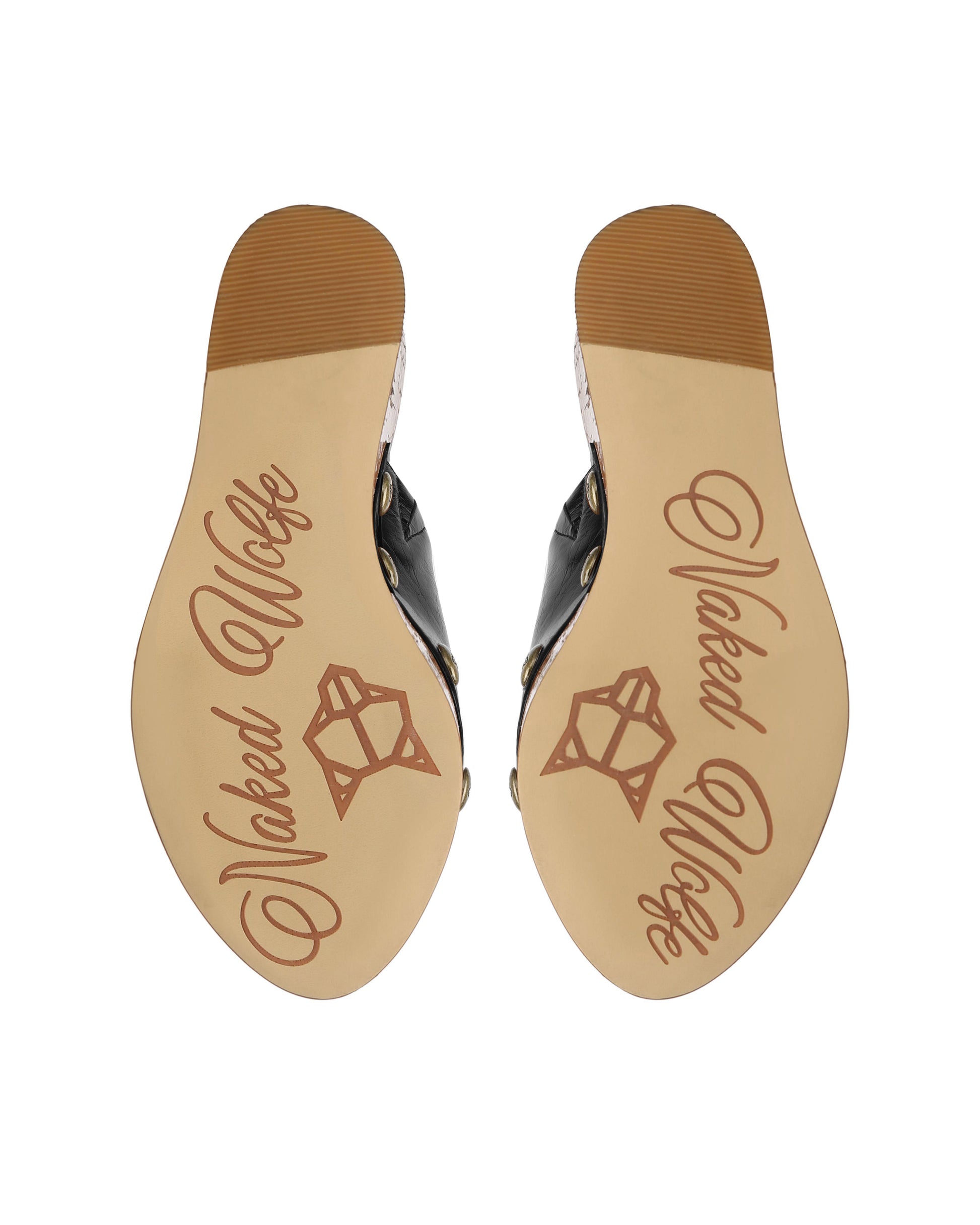 Tulip, our brand new wedged clog heel with a peep toe design is the perfect addition to any summer look. This mule upper is made of top grade luxury Italian leather. The platform is wrapped in a shiny cork wrap featuring the famous wolfe head plaque on the heel.