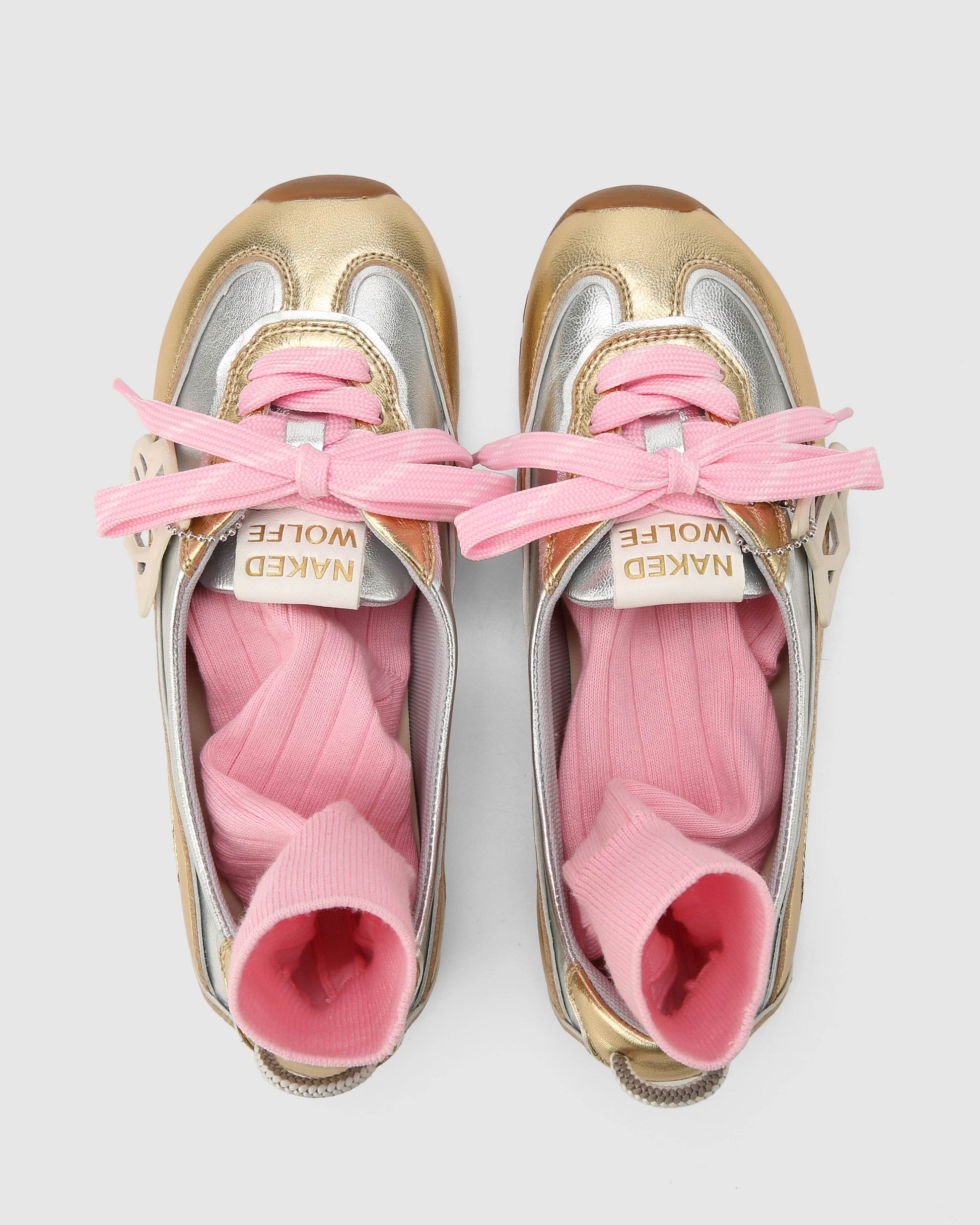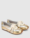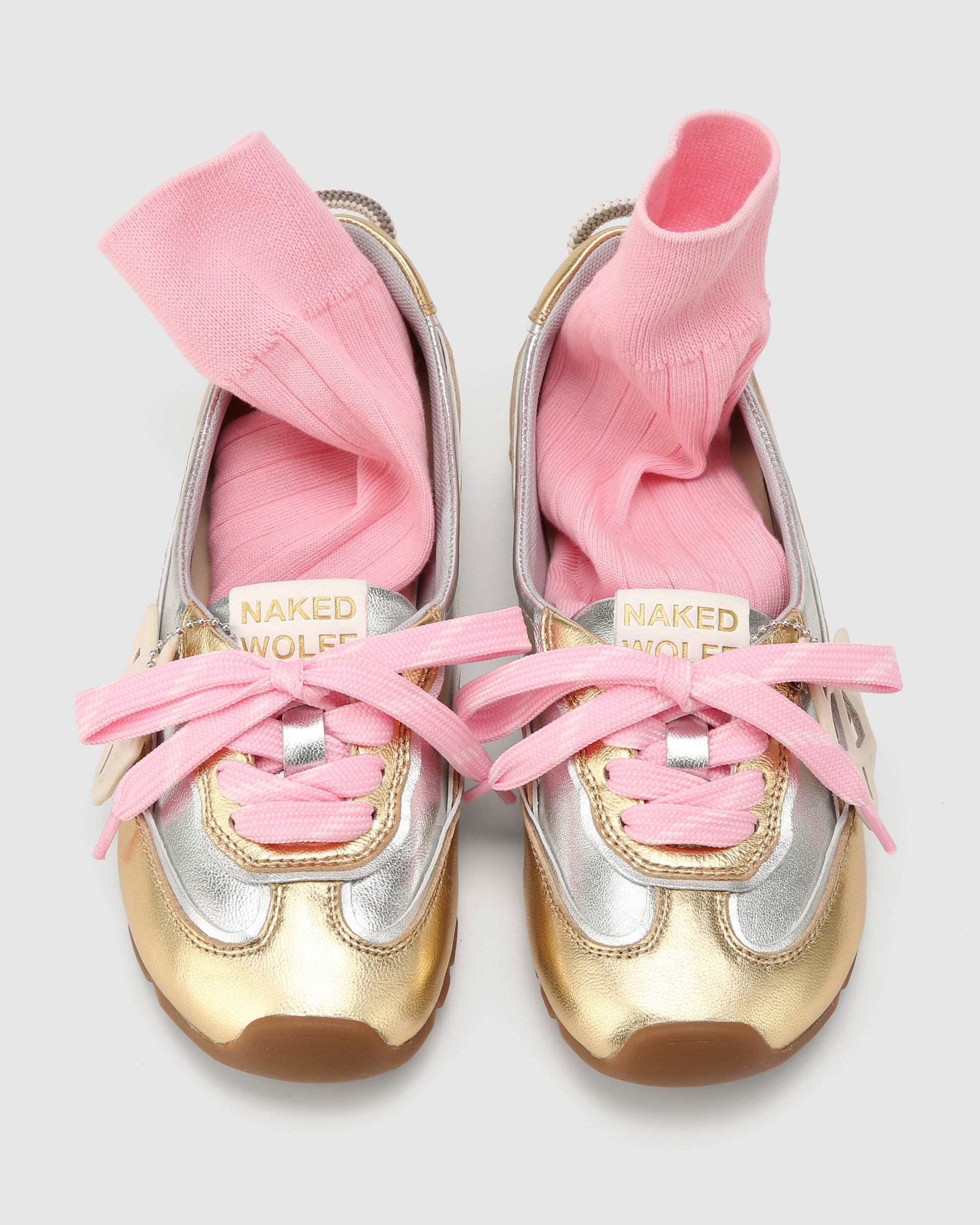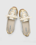 Introducing Absolute, Imagine our best selling sneaker Adored as a ballet flat design. Integrates cutting-edge design with high-performance features. Equipped with flat cotton laces and spare in the box, it ensures a secure fit and streamlined wear. Its upper, made from durable two toned metallic leathers, delivers both enhanced resilience and a distinctive textured aesthetic. This style comes paired with cotton socks in a soft pink colourway to match the interchangeable laces and to complete your look.