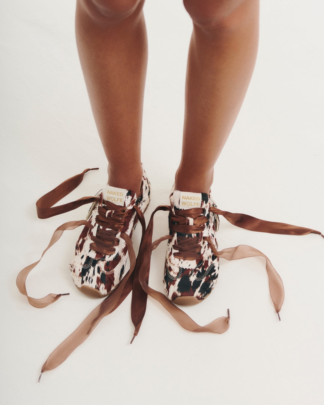 Meet Adorable: our stylish ballet sneaker in cow print calf hair with a removable wolfe head logo. Features distinctive two-tone ribbon and chiffon laces with extras included. We recommend using our protective water and stain repellent which can be purchased.