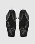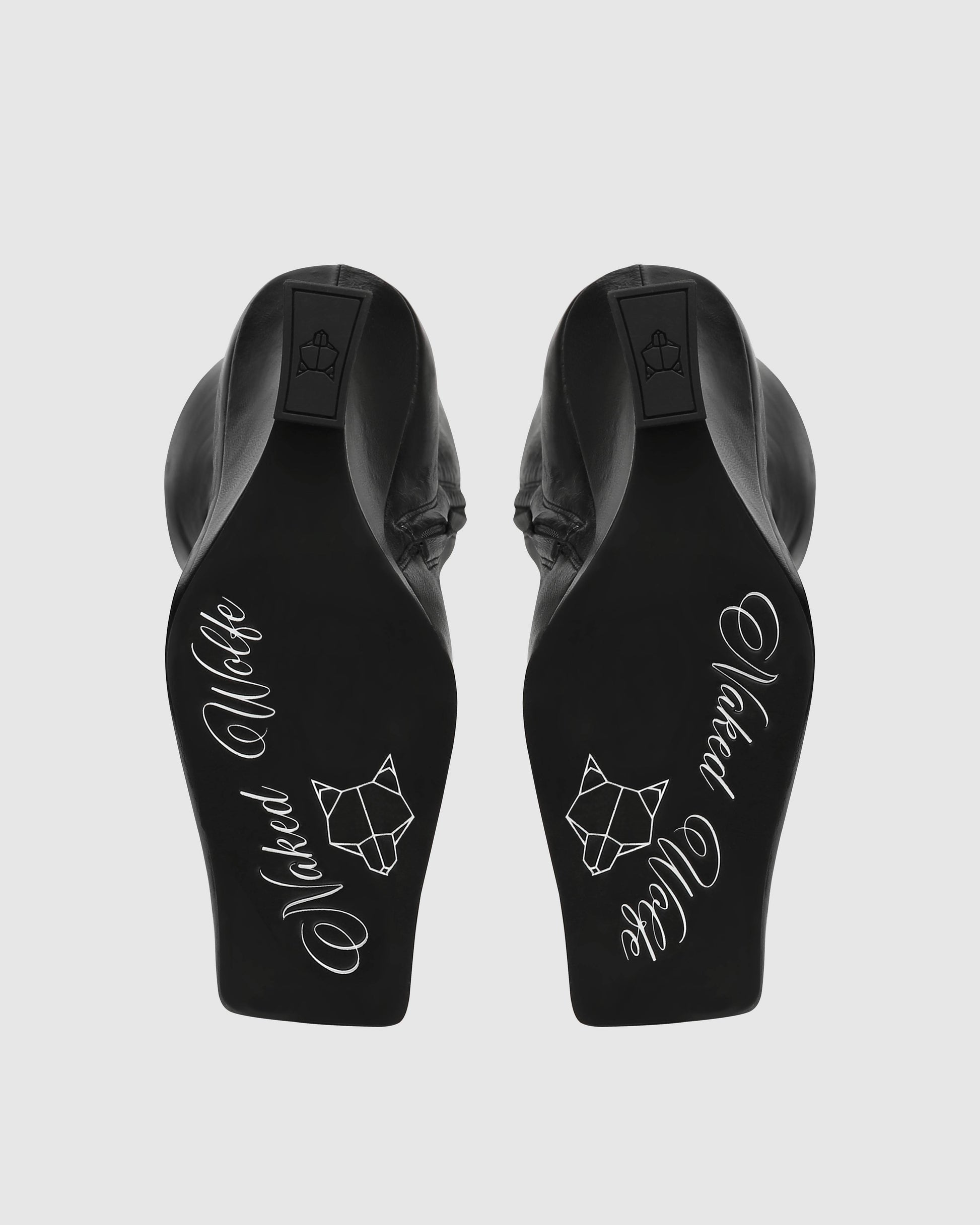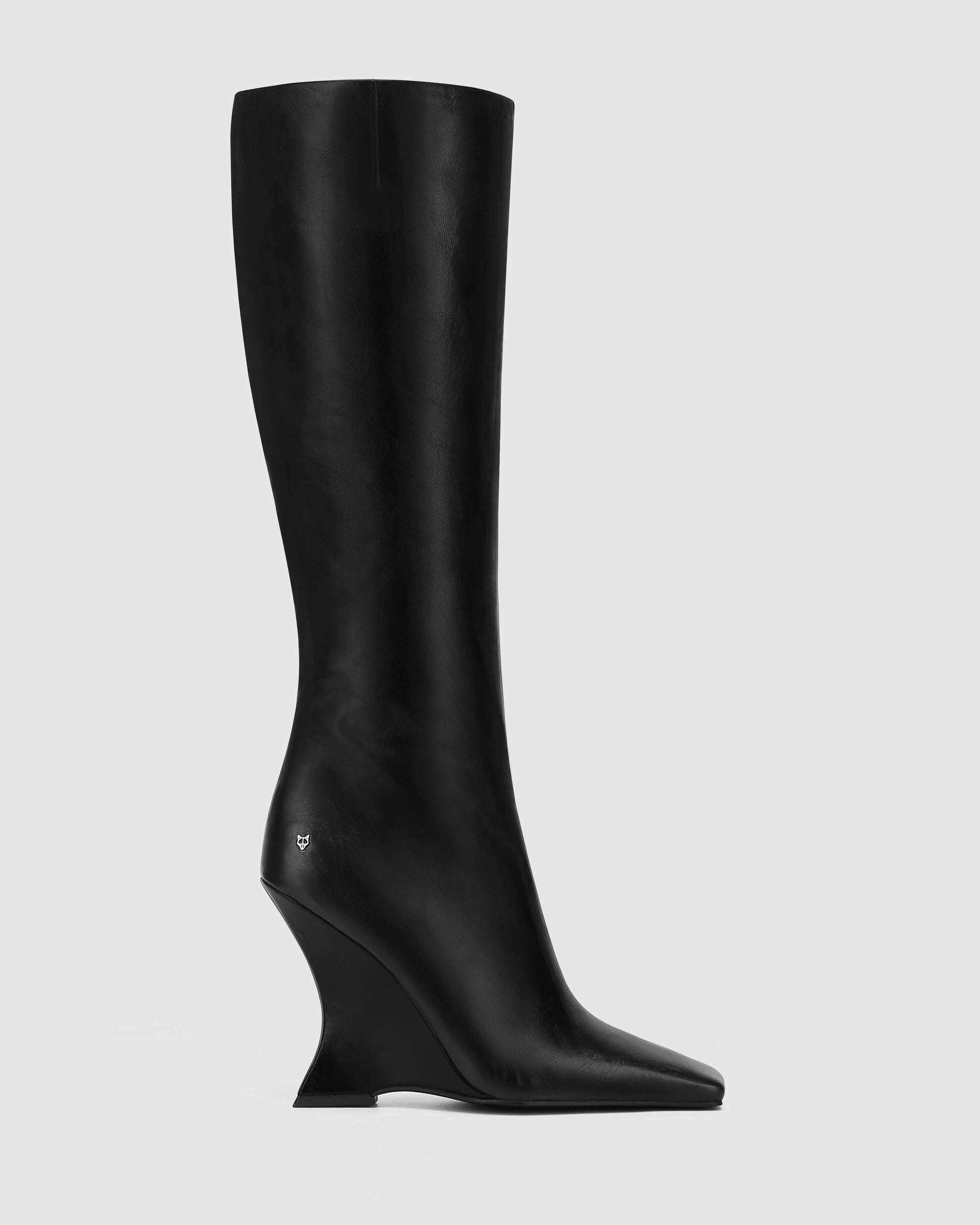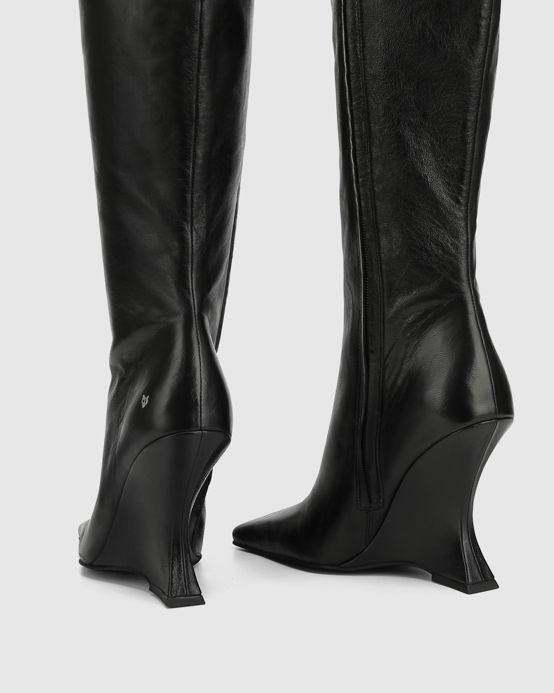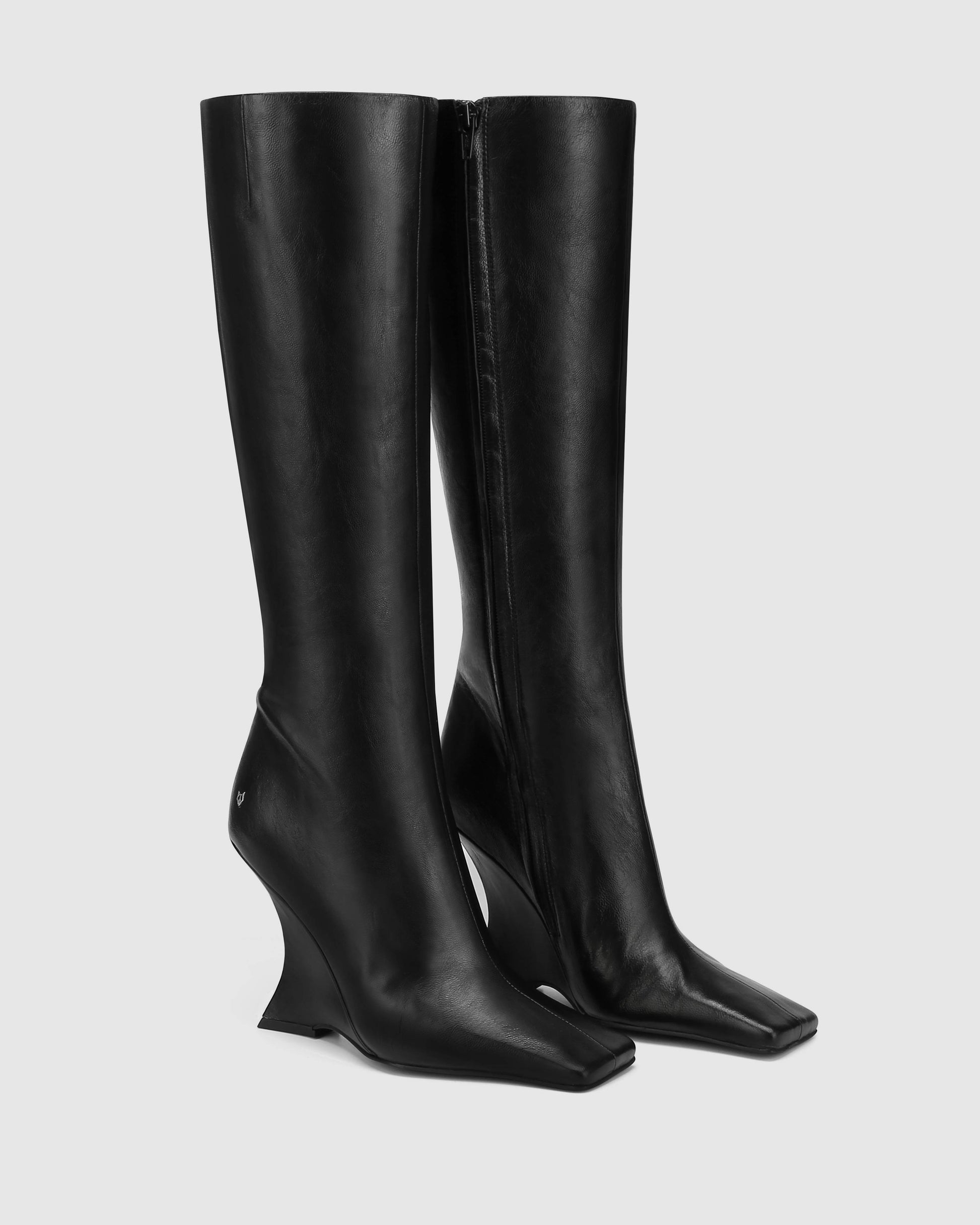 Adriana is our newest under-the-knee boot, designed with a sleek tapered square toe and a close-fitting leg made in high quality black leather. Elevated by a 105mm heel, it showcases a sprayed semi-matte finish that exudes subtle, refined luxury.