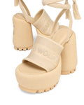 BEACH is our brand new inflated heel to join the WOW family... with a toe shape design inspired by the full moon in a new, super round shape. This style has a super cute woven upper design and summery ankle tie with a padded heel and platform to match, featuring the famous wolfe head plaque on the heel.