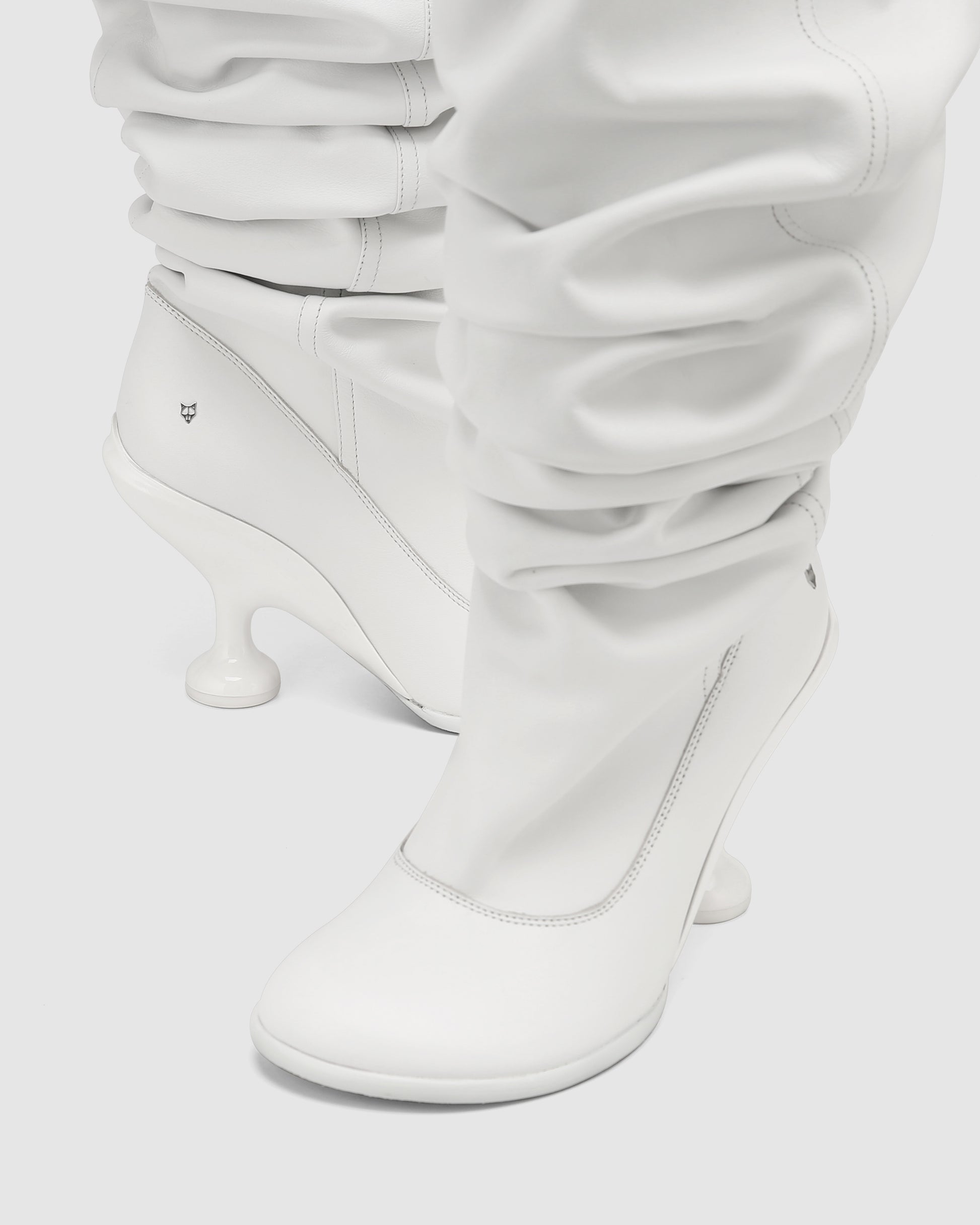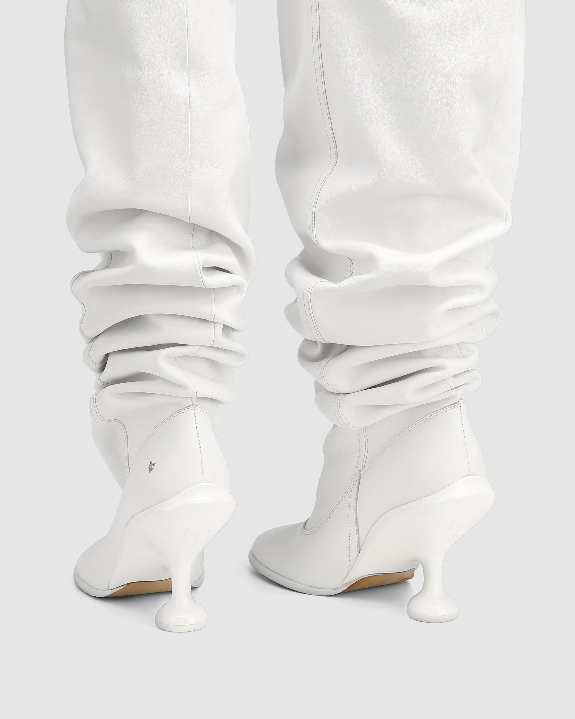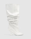 Boho, Embrace bold style with our Under-the-Knee Baggy Scrunch Boot in White Nappa Prince Leather, featuring a distinctive 9cm custom Naked Wolfe heel and a round asymmetrical toe shape. Crafted for those who love unique designs, these boots combine avant-garde flair with luxurious comfort. Perfect for making a fashion statement, they elevate any ensemble with their striking silhouette and premium leather craftsmanship.