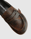 The Cord Mule. Made from an artisanal 1 of 1 Italian hand Distressed leather. Designed with a custom exaggerated last shape that pairs perfectly with flowy or baggier pants. Features an ultra-soft custom leather footbed, finished with a micro-cell custom Naked Wolfe outsole.