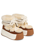 Better than ever, the iconic shearling boot makes a return with a skate twist. Darling is a shearling ankle boot, made to be slipped on and off. Made from the finest quality shearling and suede and even features a full shearling sock. Darling features a chunky rounded chord lace and a signature moulded wolfe head lace tip. This boot is highly recognisable as its built upon the iconic Slider construction.