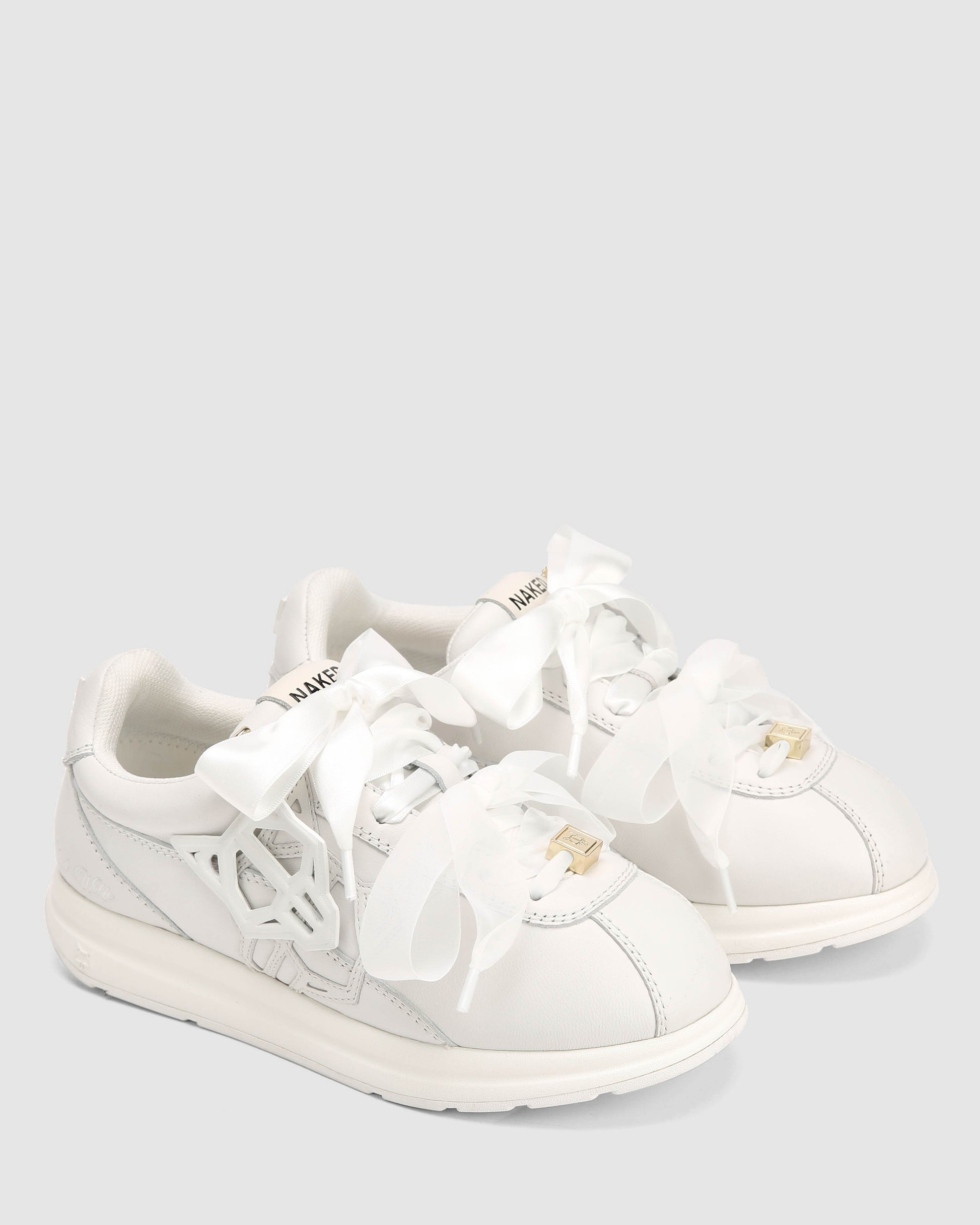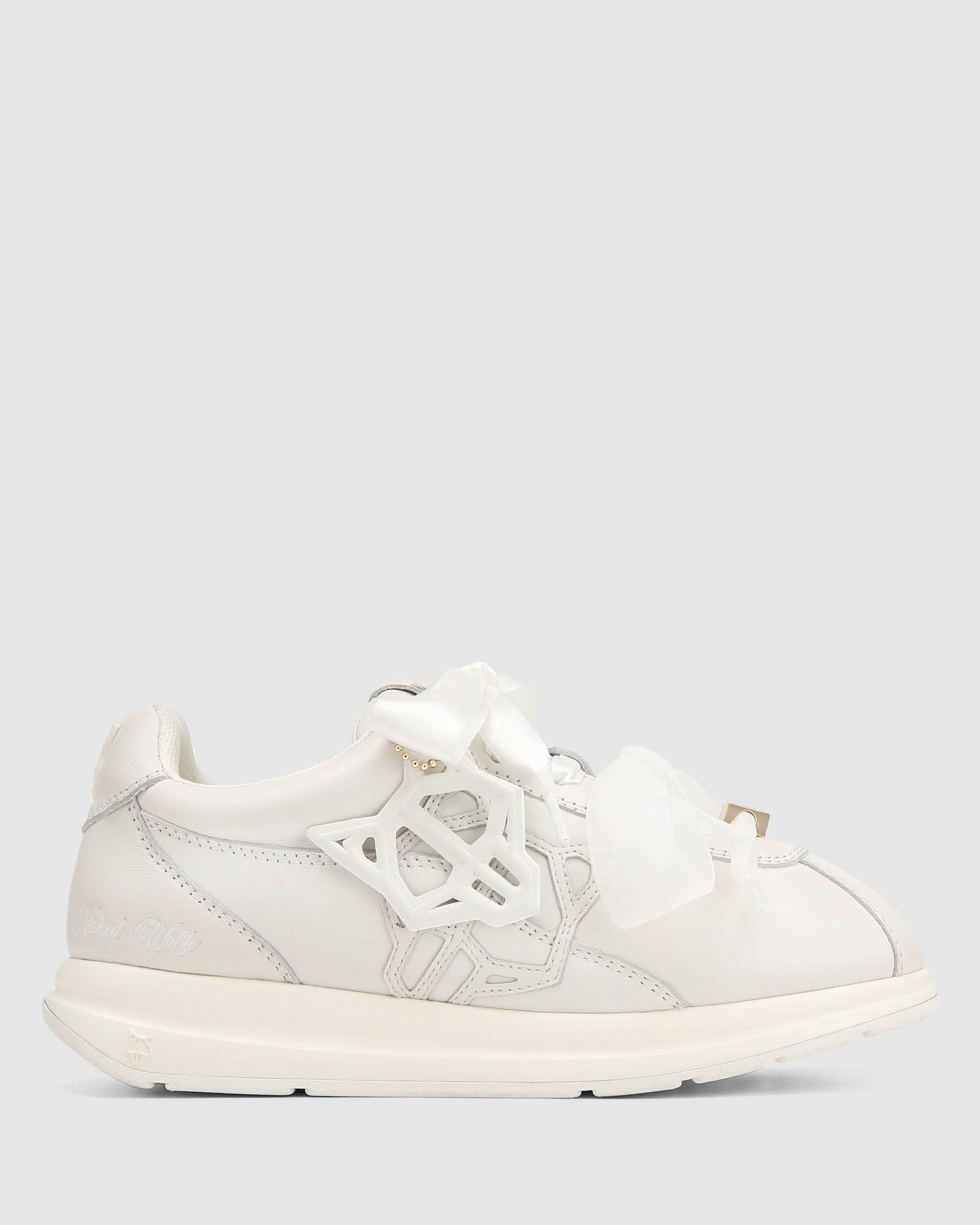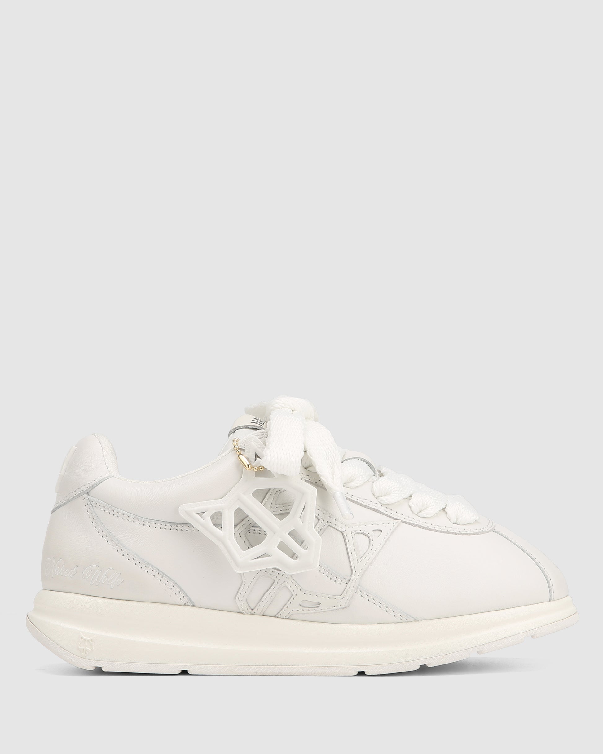 Engineered for impact. The Expense sneaker features a precision-cut cow leather upper paired with a leather logo and detachable Wolfe head patch for modular styling. Double ribbon laces offer a structured fit, while a breathable mesh lining and custom-moulded sock design enhance comfort and airflow. Finished in all over white colour way, it sits on a high-performance PU and rubber outsole with integrated Naked Wolfe branding for traction and durability.