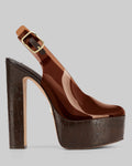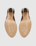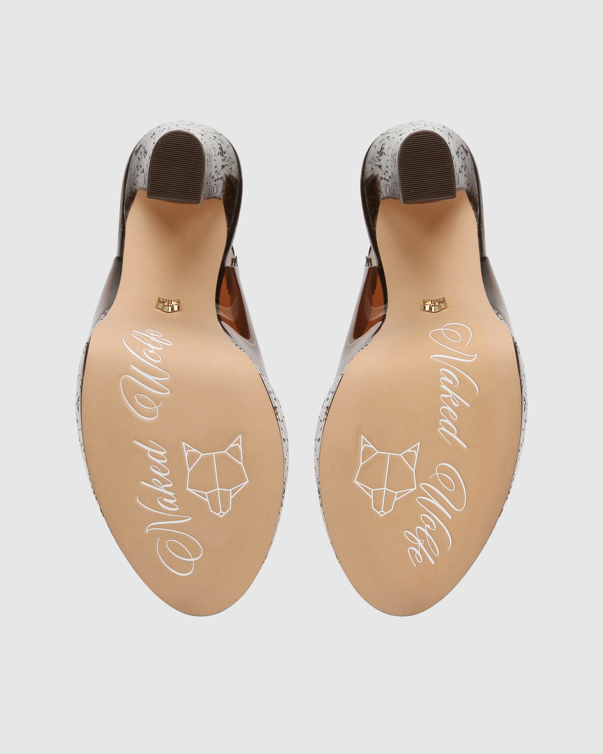 Rare, our brand new clog heel with a peep toe design is the perfect addition to any summer look. This sling back upper is made of top grade luxury perspex. The platform and heel are wrapped in a shiny cork wrap.