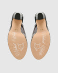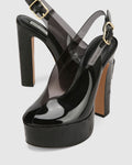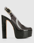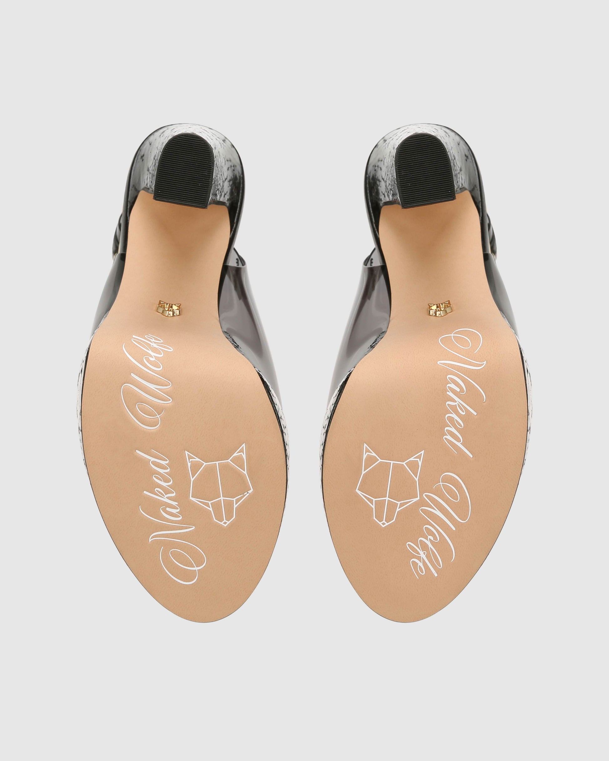 Rare, our brand new clog heel with a peep toe design is the perfect addition to any summer look. This sling back upper is made of top grade luxury perspex. The platform and heel are wrapped in a shiny cork wrap.