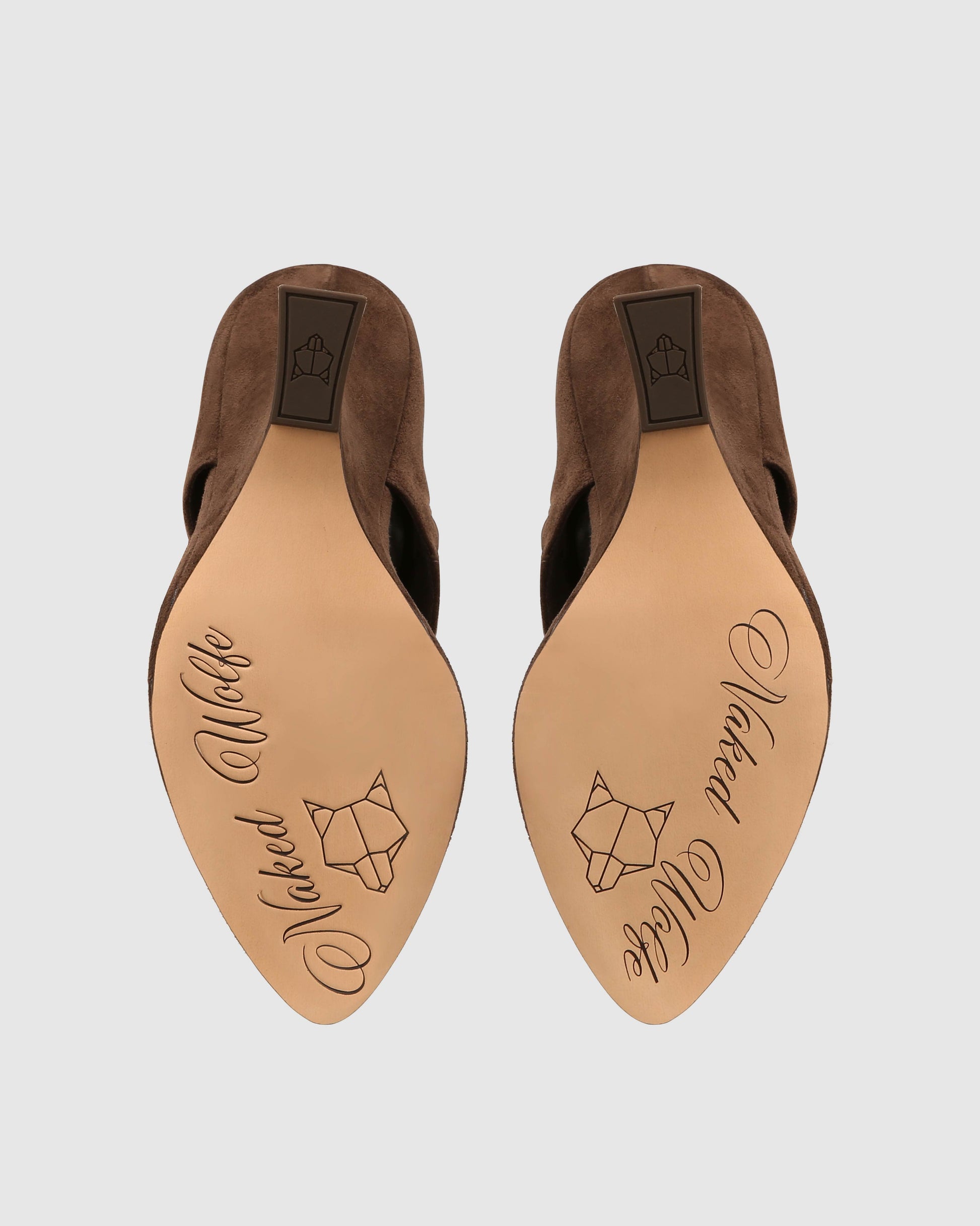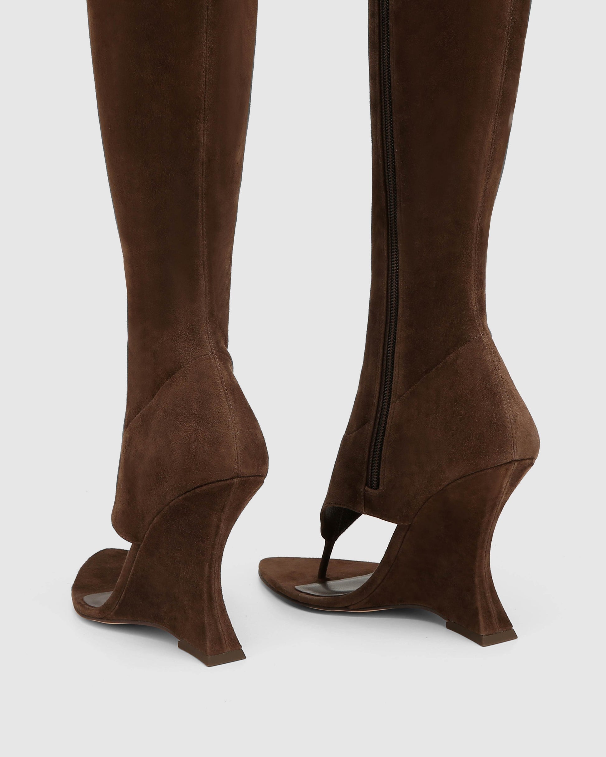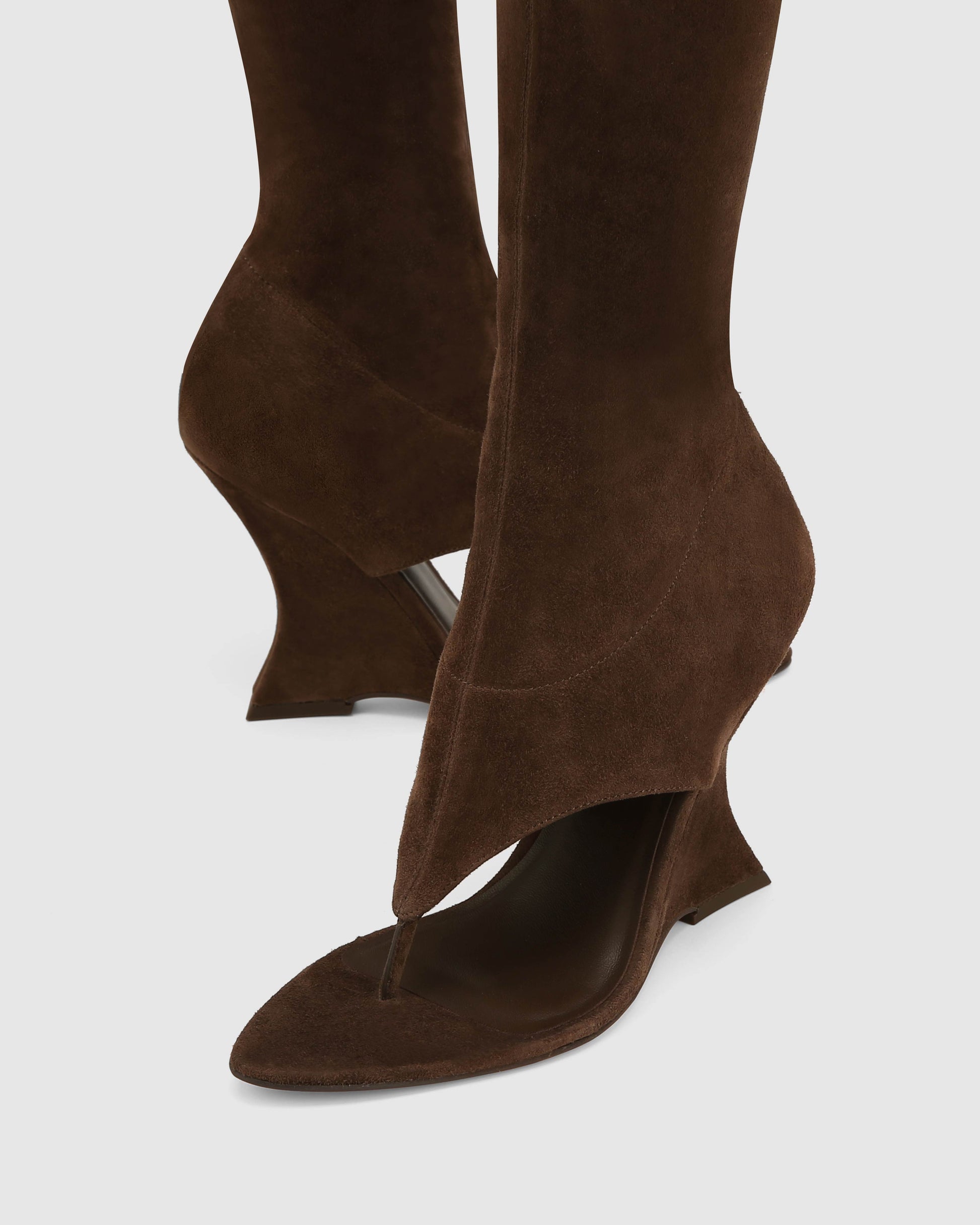 Rider our thong boot with a wedged heel, showcasing a sophisticated thong and boot leg design. Crafted from premium luxury stretch suede, this heel features a platform elegantly wrapped in matching suede.