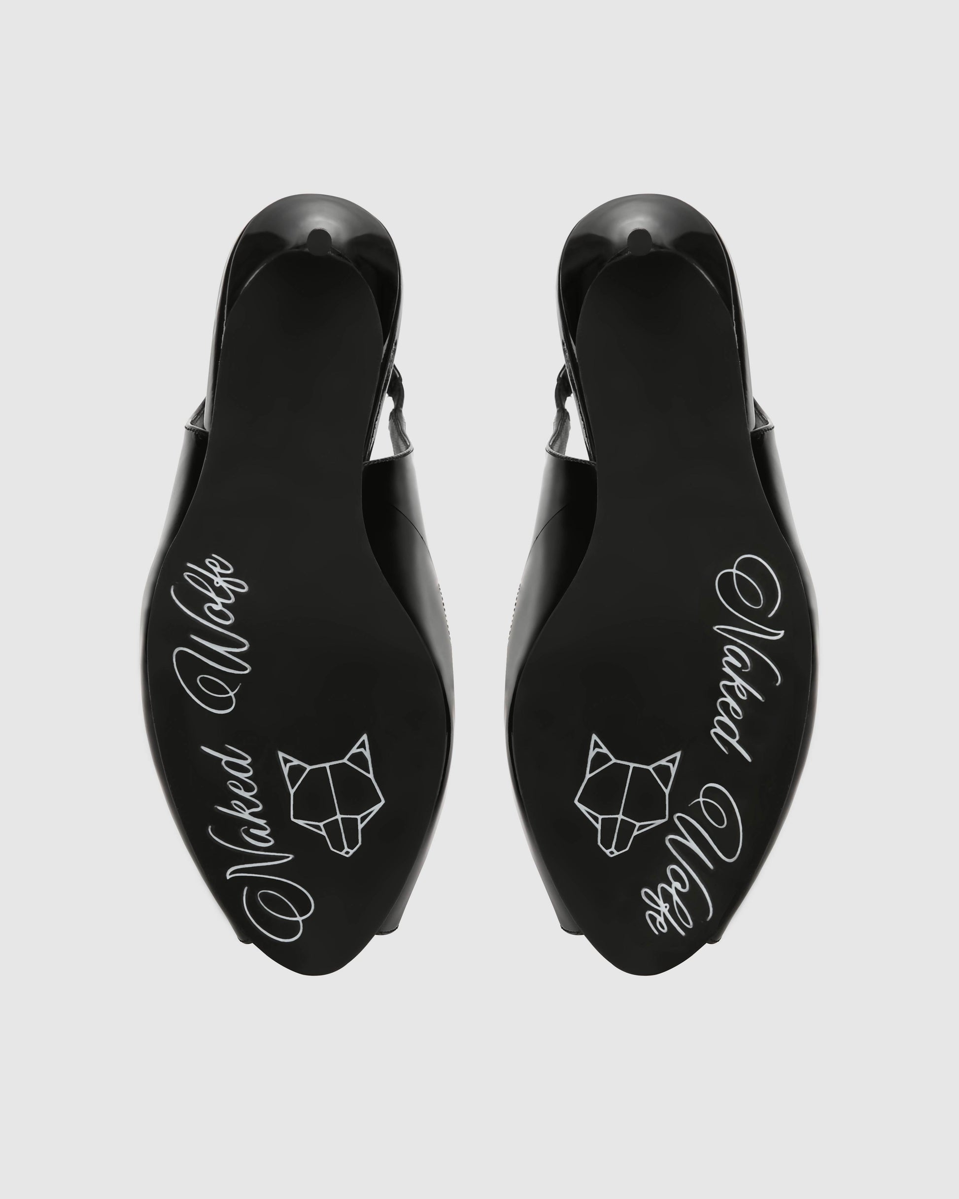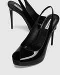 Introducing River a peep-toe heel featuring a slingback silhouette crafted from premium patent leather. The platform and heel are wrapped in matching leather for a cohesive, sleek look.